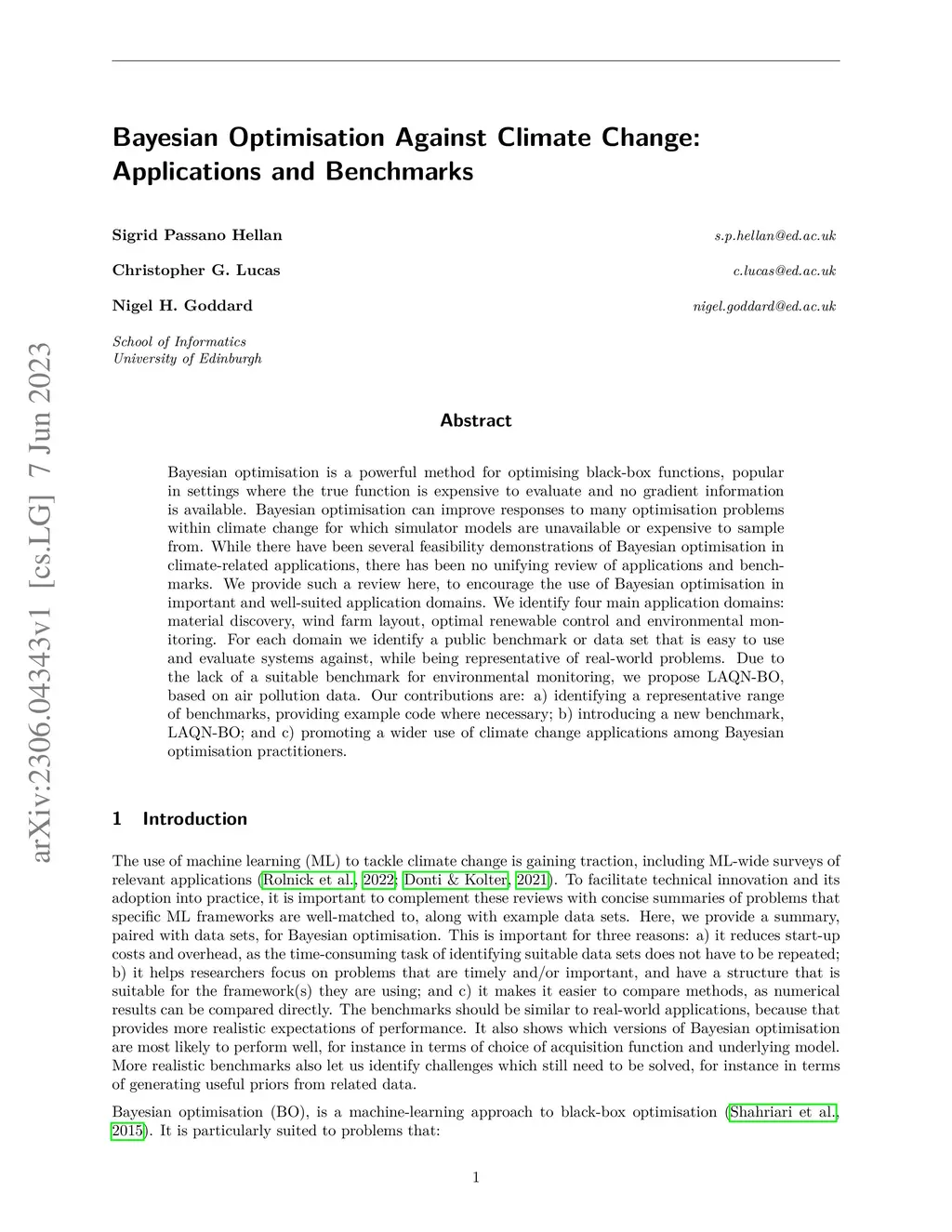 Bayesian Optimisation Against Climate Change: Applications and Benchmarks