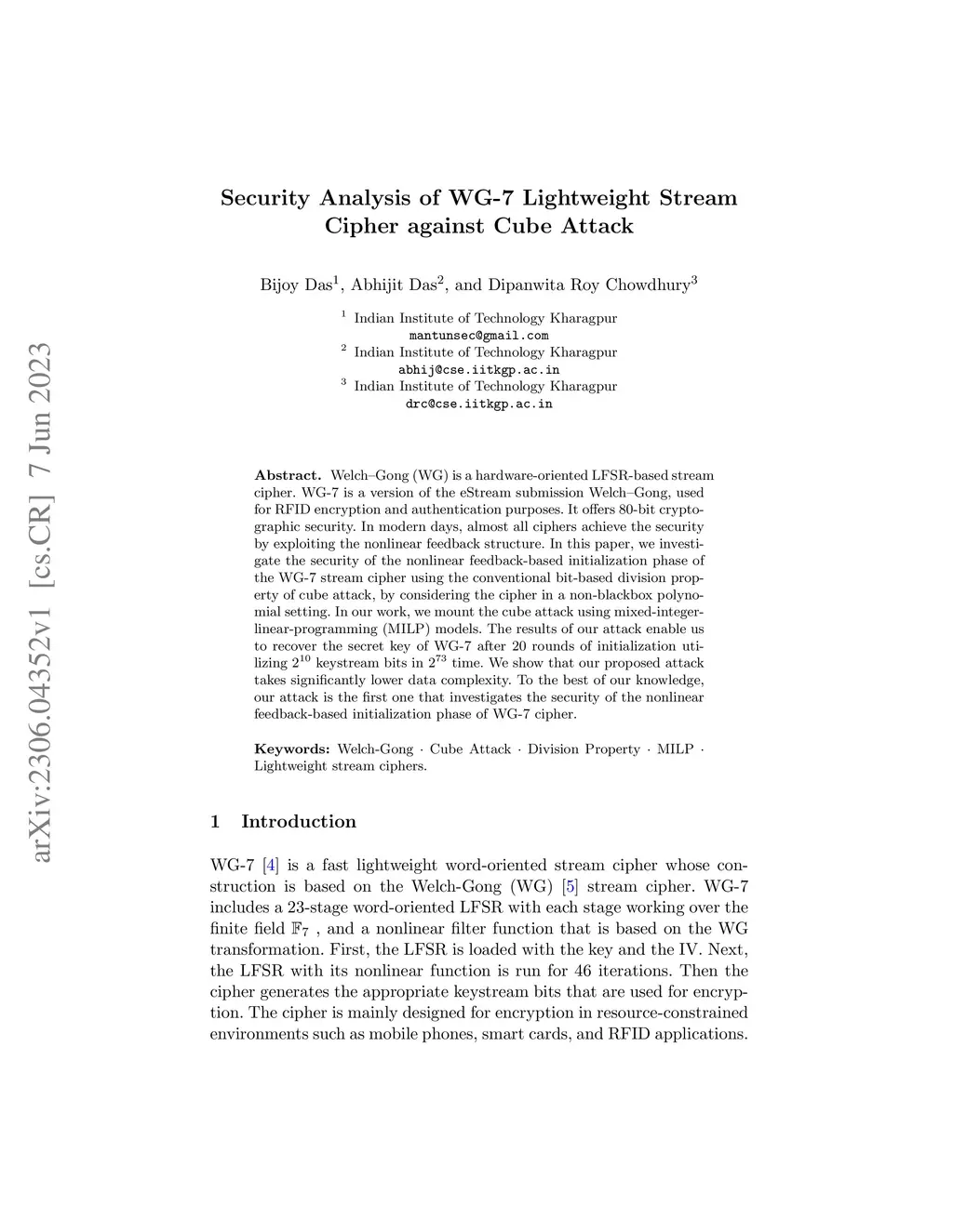 Welch--Gong (WG) is a hardware-oriented LFSR-based stream cipher. WG-7 is a version of the eStream submission Welch--Gong, used for RFID encryption and authentication purposes. It offers 80-bit cryptographic security. In modern days, almost all ciphers achieve the security by exploiting the nonlinear feedback structure. In this paper, we investigate the security of the nonlinear feedback-based initialization phase of the WG-7 stream cipher using the conventional bit-based division property of cube attack, by considering the cipher in a non-blackbox polynomial setting. In our work, we mount the cube attack using mixed-integer-linear-programming(MILP) models. The results of our attack enable us to recover the secret key of WG-7 after 20 rounds of initialization utilizing keystream bits in time. We show that our proposed attack takes significantly lower data complexity. To the best of our knowledge, our attack is the first one that investigates the security of the nonlinear feedback-based initialization phase of WG-7 cipher.