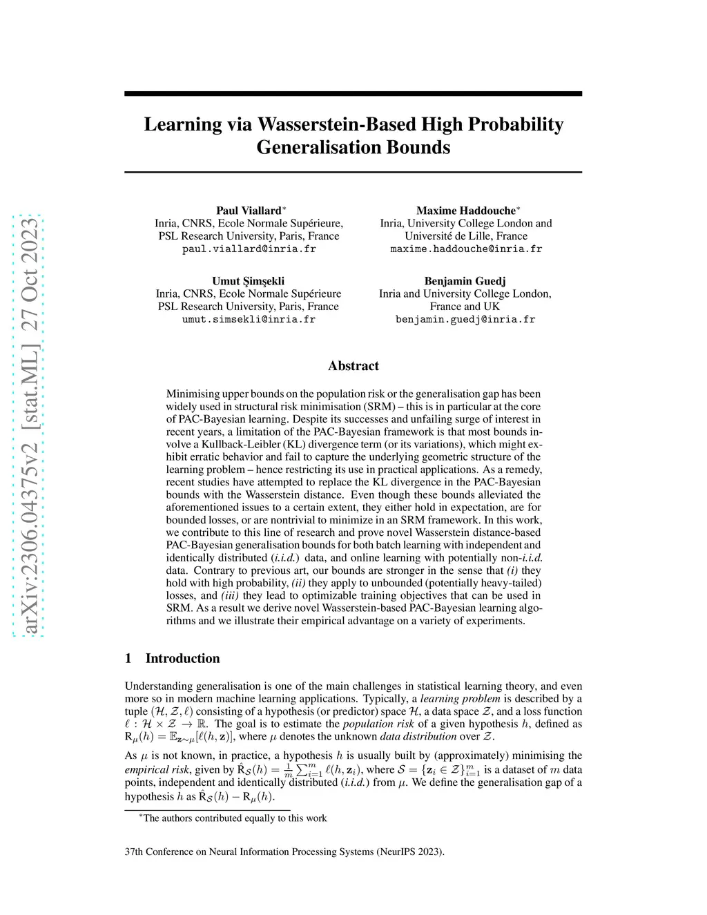 Learning via Wasserstein-Based High Probability Generalisation Bounds