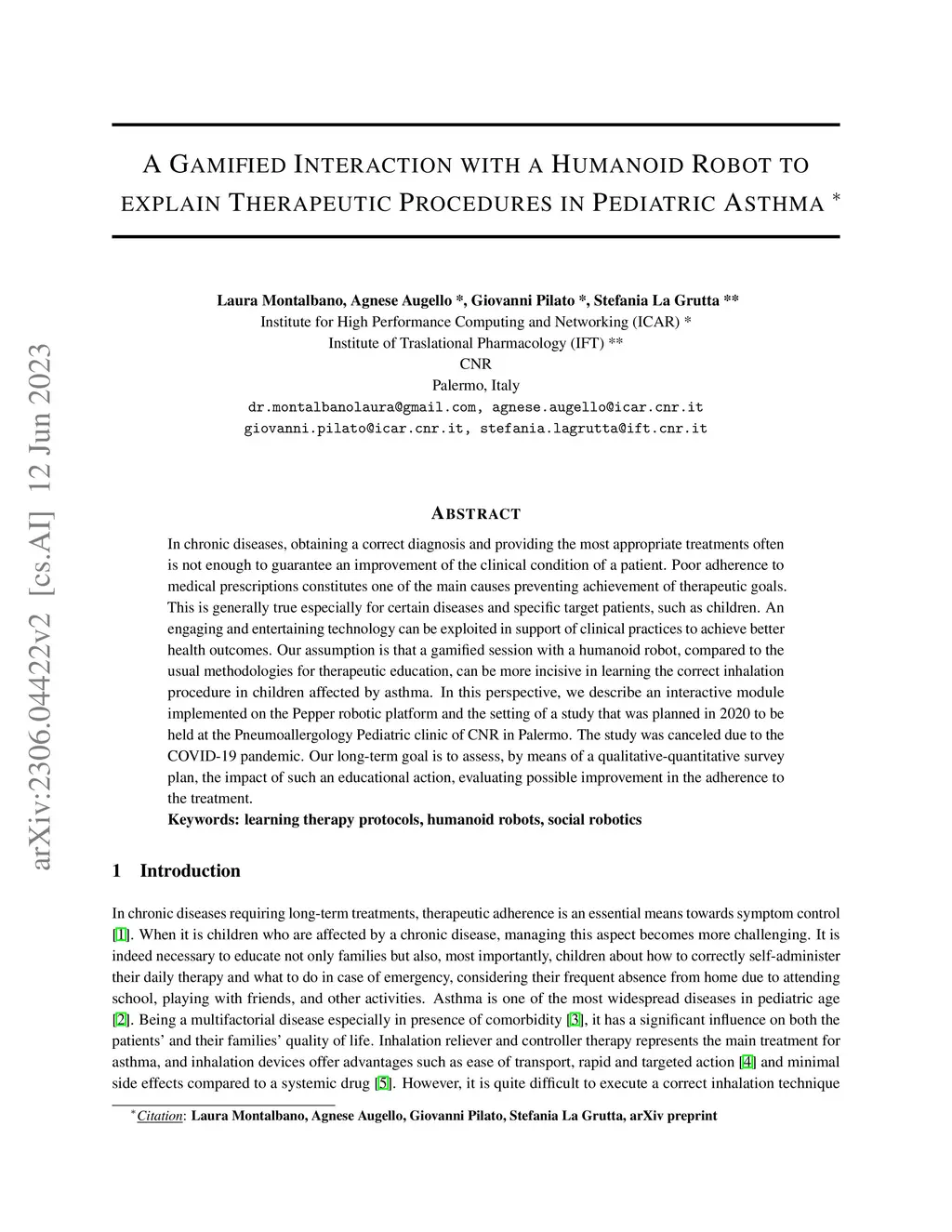 In chronic diseases, obtaining a correct diagnosis and providing the most appropriate treatments often is not enough to guarantee an improvement of the clinical condition of a patient. Poor adherence to medical prescriptions constitutes one of the main causes preventing achievement of therapeutic goals. This is generally true especially for certain diseases and specific target patients, such as children. An engaging and entertaining technology can be exploited in support of clinical practices to achieve better health outcomes. Our assumption is that a gamified session with a humanoid robot, compared to the usual methodologies for therapeutic education, can be more incisive in learning the correct inhalation procedure in children affected by asthma. In this perspective, we describe an interactive module implemented on the Pepper robotic platform and the setting of a study that was planned in 2020 to be held at the Pneumoallergology Pediatric clinic of CNR in Palermo. The study was canceled due to the COVID-19 pandemic. Our long-term goal is to assess, by means of a qualitative-quantitative survey plan, the impact of such an educational action, evaluating possible improvement in the adherence to the treatment.