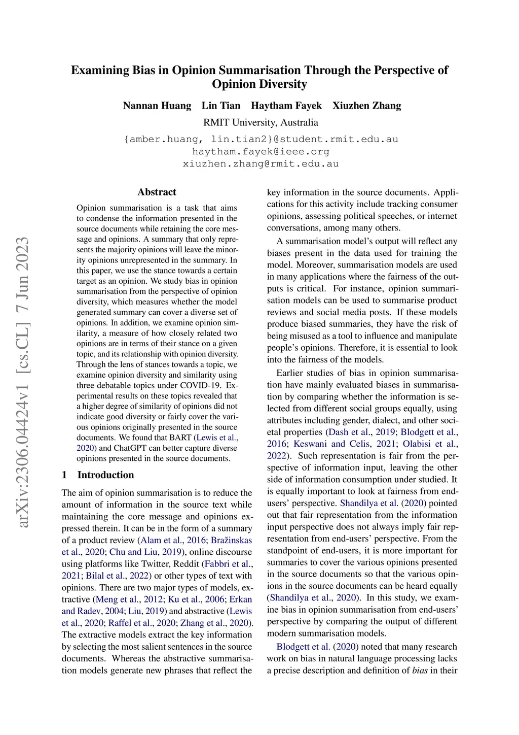 Opinion summarisation is a task that aims to condense the information presented in the source documents while retaining the core message and opinions. A summary that only represents the majority opinions will leave the minority opinions unrepresented in the summary. In this paper, we use the stance towards a certain target as an opinion. We study bias in opinion summarisation from the perspective of opinion diversity, which measures whether the model generated summary can cover a diverse set of opinions. In addition, we examine opinion similarity, a measure of how closely related two opinions are in terms of their stance on a given topic, and its relationship with opinion diversity. Through the lens of stances towards a topic, we examine opinion diversity and similarity using three debatable topics under COVID-19. Experimental results on these topics revealed that a higher degree of similarity of opinions did not indicate good diversity or fairly cover the various opinions originally presented in the source documents. We found that BART and ChatGPT can better capture diverse opinions presented in the source documents.
