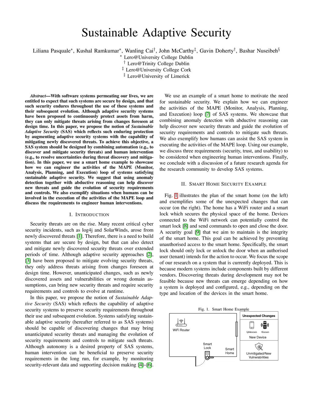 With software systems permeating our lives, we are entitled to expect that such systems are secure by design, and that such security endures throughout the use of these systems and their subsequent evolution. Although adaptive security systems have been proposed to continuously protect assets from harm, they can only mitigate threats arising from changes foreseen at design time. In this paper, we propose the notion of Sustainable Adaptive Security (SAS) which reflects such enduring protection by augmenting adaptive security systems with the capability of mitigating newly discovered threats. To achieve this objective, a SAS system should be designed by combining automation (e.g., to discover and mitigate security threats) and human intervention (e.g., to resolve uncertainties during threat discovery and mitigation). In this paper, we use a smart home example to showcase how we can engineer the activities of the MAPE (Monitor, Analysis, Planning, and Execution) loop of systems satisfying sustainable adaptive security. We suggest that using anomaly detection together with abductive reasoning can help discover new threats and guide the evolution of security requirements and controls. We also exemplify situations when humans can be involved in the execution of the activities of the MAPE loop and discuss the requirements to engineer human interventions.