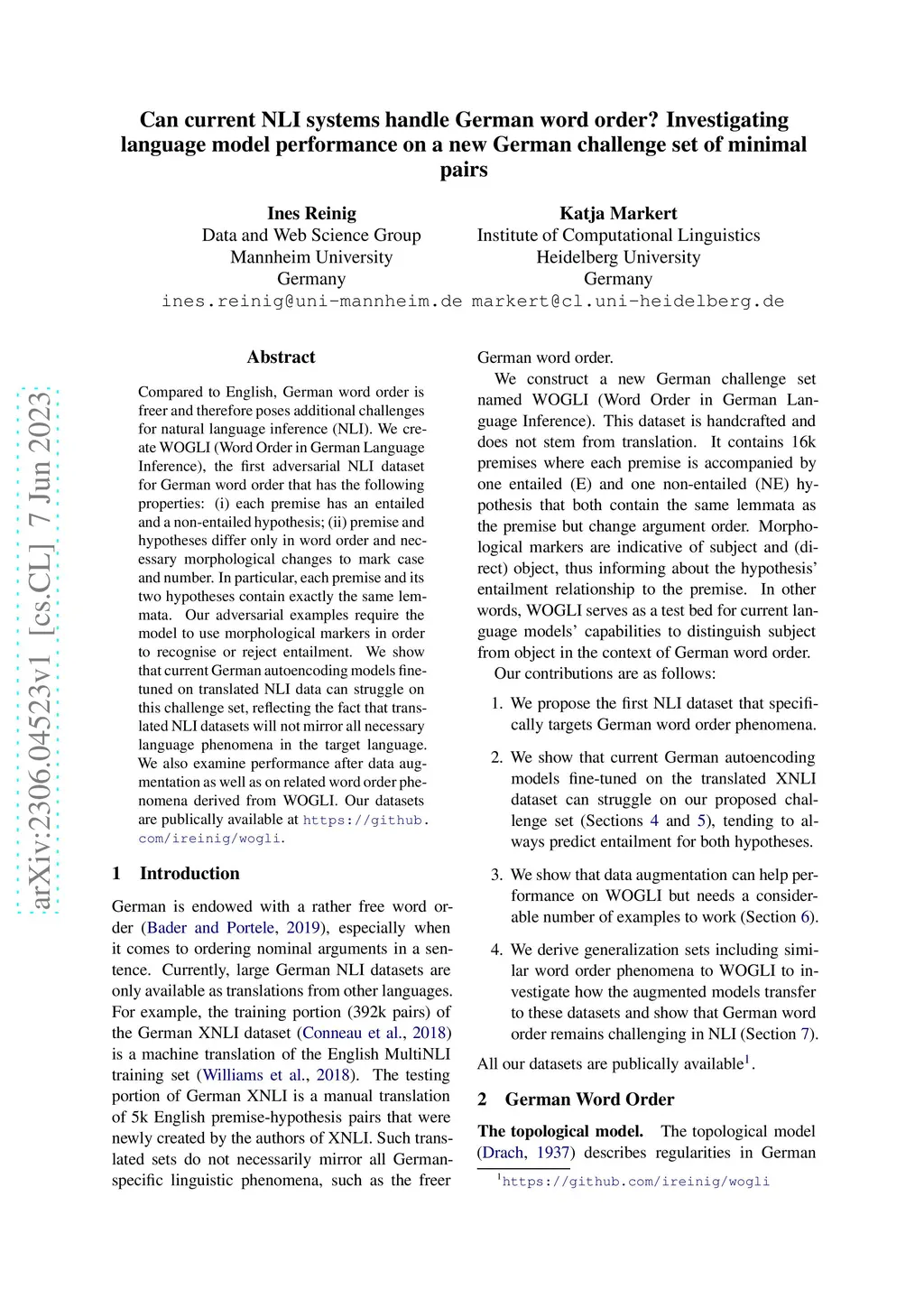 Compared to English, German word order is freer and therefore poses additional challenges for natural language inference (NLI). We create WOGLI (Word Order in German Language Inference), the first adversarial NLI dataset for German word order that has the following properties: (i) each premise has an entailed and a non-entailed hypothesis; (ii) premise and hypotheses differ only in word order and necessary morphological changes to mark case and number. In particular, each premise andits two hypotheses contain exactly the same lemmata. Our adversarial examples require the model to use morphological markers in order to recognise or reject entailment. We show that current German autoencoding models fine-tuned on translated NLI data can struggle on this challenge set, reflecting the fact that translated NLI datasets will not mirror all necessary language phenomena in the target language. We also examine performance after data augmentation as well as on related word order phenomena derived from WOGLI. Our datasets are publically available at https://github.com/ireinig/wogli.