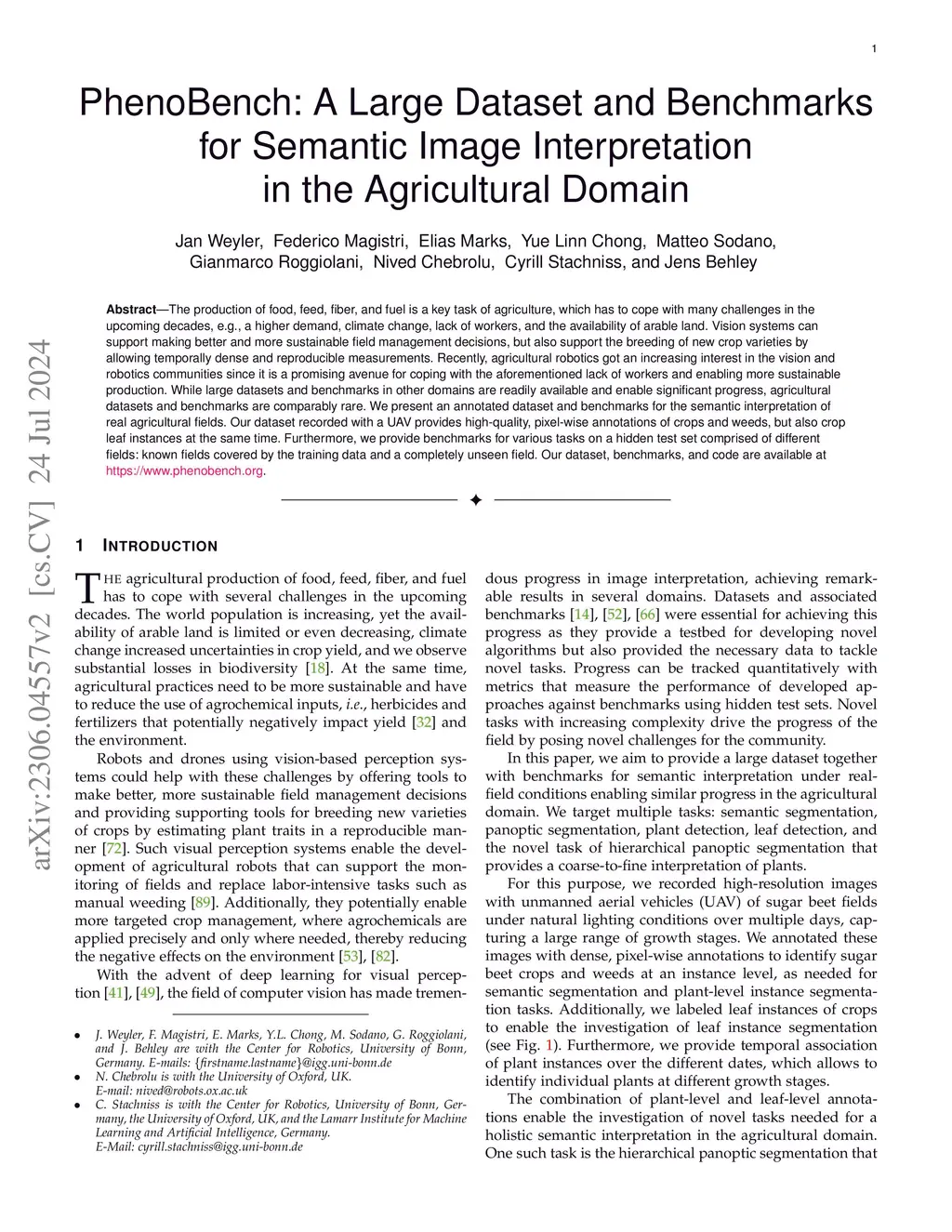 The production of food, feed, fiber, and fuel is a key task of agriculture. Especially crop production has to cope with a multitude of challenges in the upcoming decades caused by a growing world population, climate change, the need for sustainable production, lack of skilled workers, and generally the limited availability of arable land. Vision systems could help cope with these challenges by offering tools to make better and more sustainable field management decisions and support the breeding of new varieties of crops by allowing temporally dense and reproducible measurements. Recently, tackling perception tasks in the agricultural domain got increasing interest in the computer vision and robotics community since agricultural robotics are one promising solution for coping with the lack of workers and enable a more sustainable agricultural production at the same time. While large datasets and benchmarks in other domains are readily available and have enabled significant progress toward more reliable vision systems, agricultural datasets and benchmarks are comparably rare. In this paper, we present a large dataset and benchmarks for the semantic interpretation of images of real agricultural fields. Our dataset recorded with a UAV provides high-quality, dense annotations of crops and weeds, but also fine-grained labels of crop leaves at the same time, which enable the development of novel algorithms for visual perception in the agricultural domain. Together with the labeled data, we provide novel benchmarks for evaluating different visual perception tasks on a hidden test set comprised of different fields: known fields covered by the training data and a completely unseen field. The tasks cover semantic segmentation, panoptic segmentation of plants, leaf instance segmentation, detection of plants and leaves, and hierarchical panoptic segmentation for jointly identifying plants and leaves.