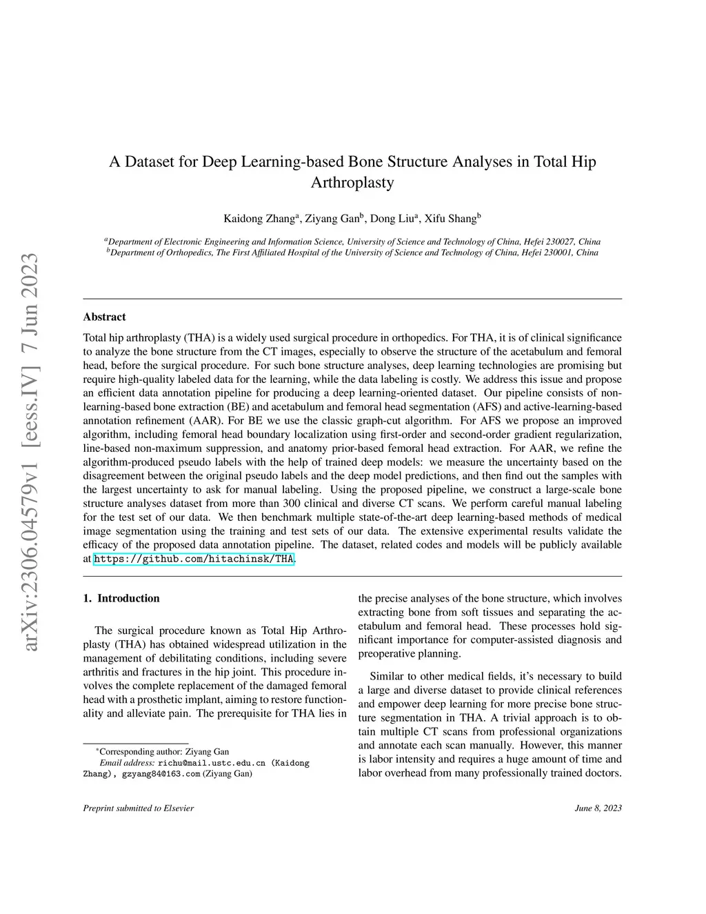 Total hip arthroplasty (THA) is a widely used surgical procedure in orthopedics. For THA, it is of clinical significance to analyze the bone structure from the CT images, especially to observe the structure of the acetabulum and femoral head, before the surgical procedure. For such bone structure analyses, deep learning technologies are promising but require high-quality labeled data for the learning, while the data labeling is costly. We address this issue and propose an efficient data annotation pipeline for producing a deep learning-oriented dataset. Our pipeline consists of non-learning-based bone extraction (BE) and acetabulum and femoral head segmentation (AFS) and active-learning-based annotation refinement (AAR). For BE we use the classic graph-cut algorithm. For AFS we propose an improved algorithm, including femoral head boundary localization using first-order and second-order gradient regularization, line-based non-maximum suppression, and anatomy prior-based femoral head extraction. For AAR, we refine the algorithm-produced pseudo labels with the help of trained deep models: we measure the uncertainty based on the disagreement between the original pseudo labels and the deep model predictions, and then find out the samples with the largest uncertainty to ask for manual labeling. Using the proposed pipeline, we construct a large-scale bone structure analyses dataset from more than 300 clinical and diverse CT scans. We perform careful manual labeling for the test set of our data. We then benchmark multiple state-of-the art deep learning-based methods of medical image segmentation using the training and test sets of our data. The extensive experimental results validate the efficacy of the proposed data annotation pipeline. The dataset, related codes and models will be publicly available at https://github.com/hitachinsk/THA.