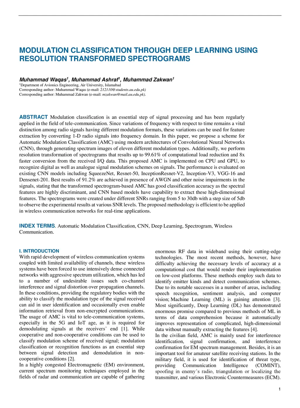 Modulation classification is an essential step of signal processing and has been regularly applied in the field of tele-communication. Since variations of frequency with respect to time remains a vital distinction among radio signals having different modulation formats, these variations can be used for feature extraction by converting 1-D radio signals into frequency domain. In this paper, we propose a scheme for Automatic Modulation Classification (AMC) using modern architectures of Convolutional Neural Networks (CNN), through generating spectrum images of eleven different modulation types. Additionally, we perform resolution transformation of spectrograms that results up to 99.61% of computational load reduction and 8x faster conversion from the received I/Q data. This proposed AMC is implemented on CPU and GPU, to recognize digital as well as analogue signal modulation schemes on signals. The performance is evaluated on existing CNN models including SqueezeNet, Resnet-50, InceptionResnet-V2, Inception-V3, VGG-16 and Densenet-201. Best results of 91.2% are achieved in presence of AWGN and other noise impairments in the signals, stating that the transformed spectrogram-based AMC has good classification accuracy as the spectral features are highly discriminant, and CNN based models have capability to extract these high-dimensional features. The spectrograms were created under different SNRs ranging from 5 to 30db with a step size of 5db to observe the experimental results at various SNR levels. The proposed methodology is efficient to be applied in wireless communication networks for real-time applications.