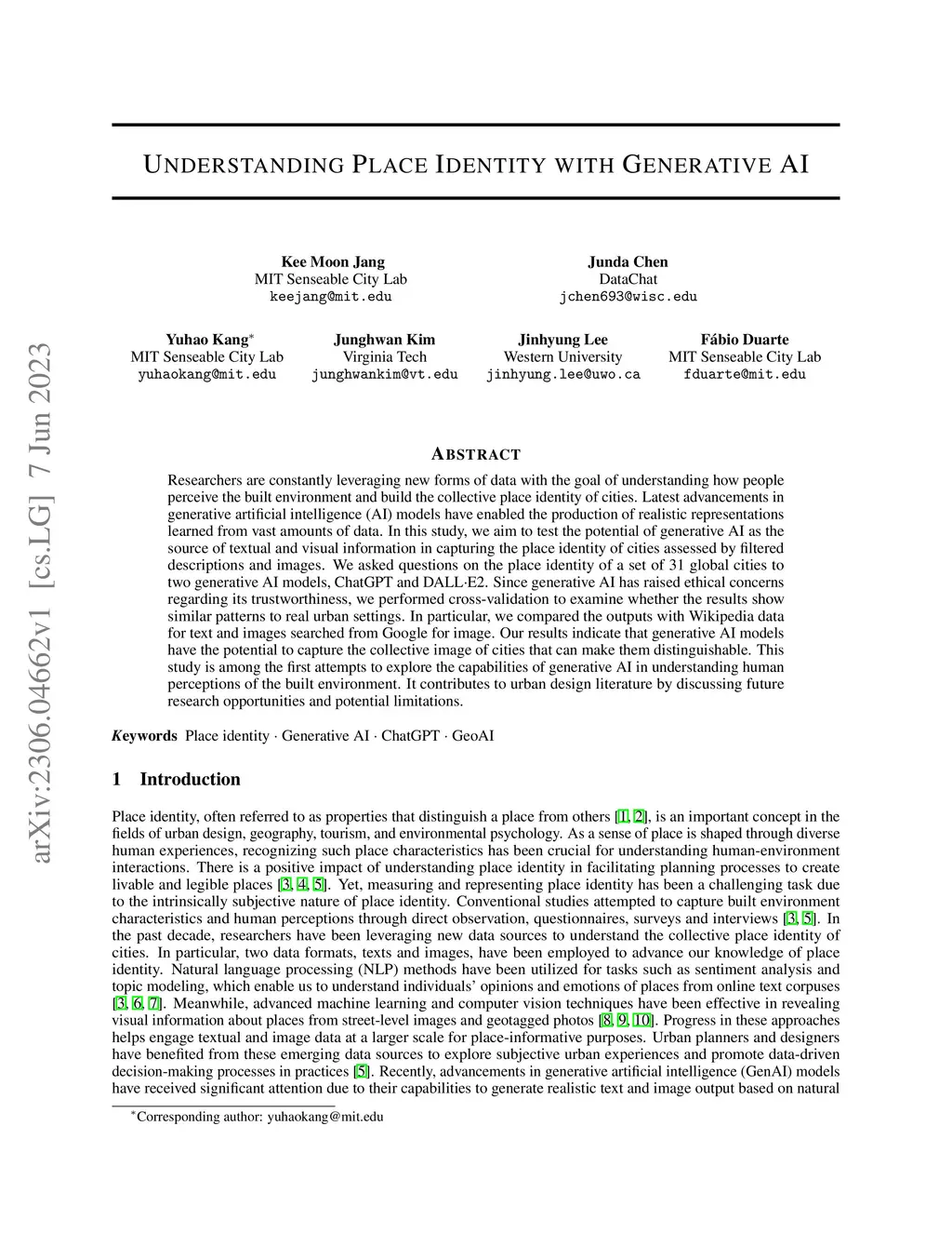 Researchers are constantly leveraging new forms of data with the goal of understanding how people perceive the built environment and build the collective place identity of cities. Latest advancements in generative artificial intelligence (AI) models have enabled the production of realistic representations learned from vast amounts of data. In this study, we aim to test the potential of generative AI as the source of textual and visual information in capturing the place identity of cities assessed by filtered descriptions and images. We asked questions on the place identity of a set of 31 global cities to two generative AI models, ChatGPT and DALL-E2. Since generative AI has raised ethical concerns regarding its trustworthiness, we performed cross-validation to examine whether the results show similar patterns to real urban settings. In particular, we compared the outputs with Wikipedia data for text and images searched from Google for image. Our results indicate that generative AI models have the potential to capture the collective image of cities that can make them distinguishable. This study is among the first attempts to explore the capabilities of generative AI in understanding human perceptions of the built environment. It contributes to urban design literature by discussing future research opportunities and potential limitations.