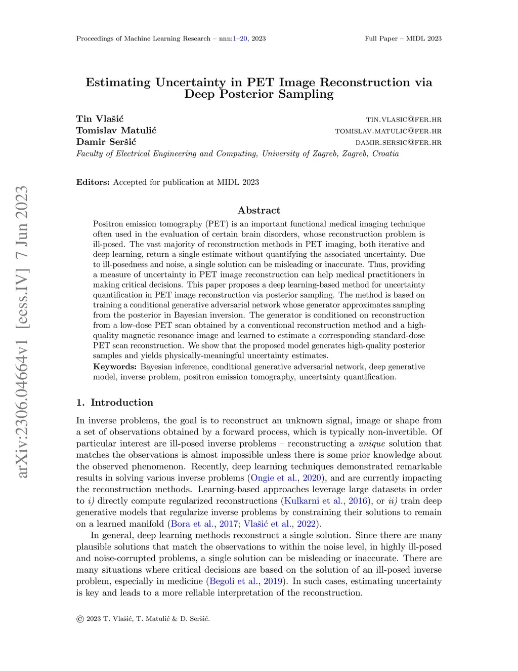 Positron emission tomography (PET) is an important functional medical imaging technique often used in the evaluation of certain brain disorders, whose reconstruction problem is ill-posed. The vast majority of reconstruction methods in PET imaging, both iterative and deep learning, return a single estimate without quantifying the associated uncertainty. Due to ill-posedness and noise, a single solution can be misleading or inaccurate. Thus, providing a measure of uncertainty in PET image reconstruction can help medical practitioners in making critical decisions. This paper proposes a deep learning-based method for uncertainty quantification in PET image reconstruction via posterior sampling. The method is based on training a conditional generative adversarial network whose generator approximates sampling from the posterior in Bayesian inversion. The generator is conditioned on reconstruction from a low-dose PET scan obtained by a conventional reconstruction method and a high-quality magnetic resonance image and learned to estimate a corresponding standard-dose PET scan reconstruction. We show that the proposed model generates high-quality posterior samples and yields physically-meaningful uncertainty estimates.