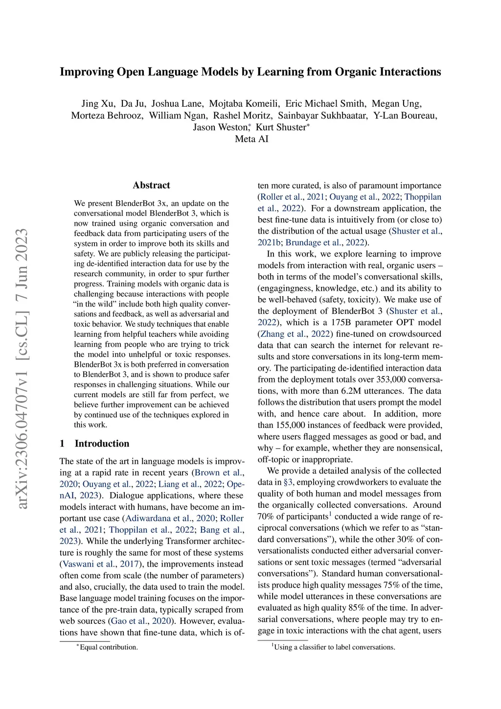 We present BlenderBot 3x, an update on the conversational model BlenderBot 3, which is now trained using organic conversation and feedback data from participating users of the system in order to improve both its skills and safety. We are publicly releasing the participating de-identified interaction data for use by the research community, in order to spur further progress. Training models with organic data is challenging because interactions with people "in the wild" include both high quality conversations and feedback, as well as adversarial and toxic behavior. We study techniques that enable learning from helpful teachers while avoiding learning from people who are trying to trick the model into unhelpful or toxic responses. BlenderBot 3x is both preferred in conversation to BlenderBot 3, and is shown to produce safer responses in challenging situations. While our current models are still far from perfect, we believe further improvement can be achieved by continued use of the techniques explored in this work.
