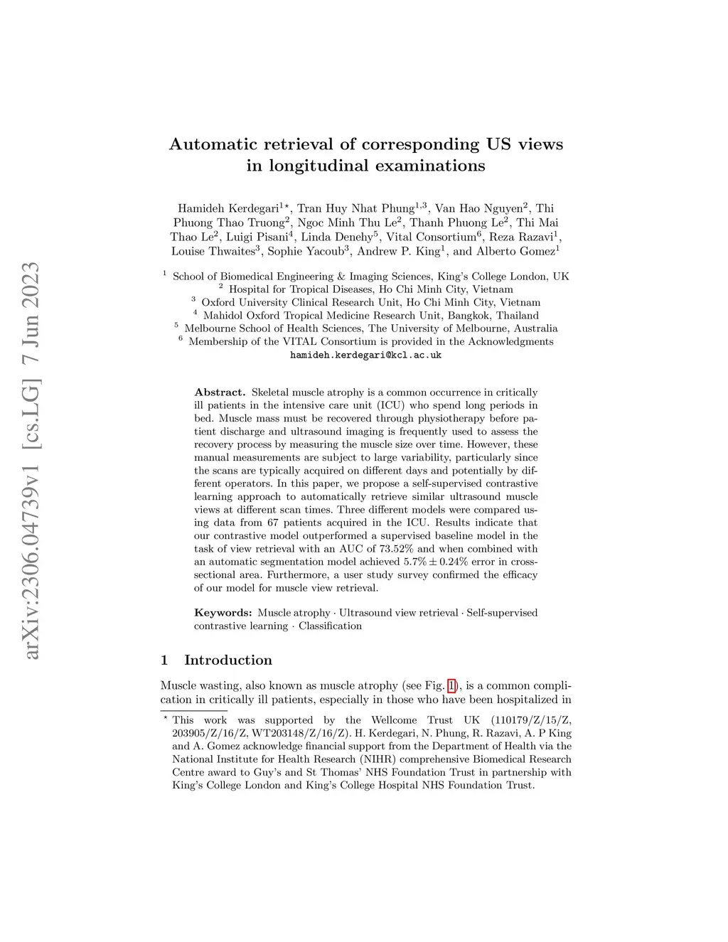 Skeletal muscle atrophy is a common occurrence in critically ill patients in the intensive care unit (ICU) who spend long periods in bed. Muscle mass must be recovered through physiotherapy before patient discharge and ultrasound imaging is frequently used to assess the recovery process by measuring the muscle size over time. However, these manual measurements are subject to large variability, particularly since the scans are typically acquired on different days and potentially by different operators. In this paper, we propose a self-supervised contrastive learning approach to automatically retrieve similar ultrasound muscle views at different scan times. Three different models were compared using data from 67 patients acquired in the ICU. Results indicate that our contrastive model outperformed a supervised baseline model in the task of view retrieval with an AUC of 73.52% and when combined with an automatic segmentation model achieved 5.7%+/-0.24% error in cross-sectional area. Furthermore, a user study survey confirmed the efficacy of our model for muscle view retrieval.