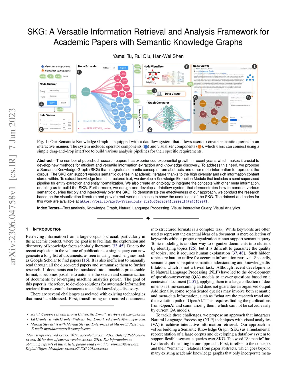 The number of published research papers has experienced exponential growth in recent years, which makes it crucial to develop new methods for efficient and versatile information extraction and knowledge discovery. To address this need, we propose a Semantic Knowledge Graph (SKG) that integrates semantic concepts from abstracts and other meta-information to represent the corpus. The SKG can support various semantic queries in academic literature thanks to the high diversity and rich information content stored within. To extract knowledge from unstructured text, we develop a Knowledge Extraction Module that includes a semi-supervised pipeline for entity extraction and entity normalization. We also create an ontology to integrate the concepts with other meta information, enabling us to build the SKG. Furthermore, we design and develop a dataflow system that demonstrates how to conduct various semantic queries flexibly and interactively over the SKG. To demonstrate the effectiveness of our approach, we conduct the research based on the visualization literature and provide real-world use cases to show the usefulness of the SKG. The dataset and codes for this work are available at https://osf.io/aqv8p/?view_only=2c26b36e3e3941ce999df47e4616207f.
