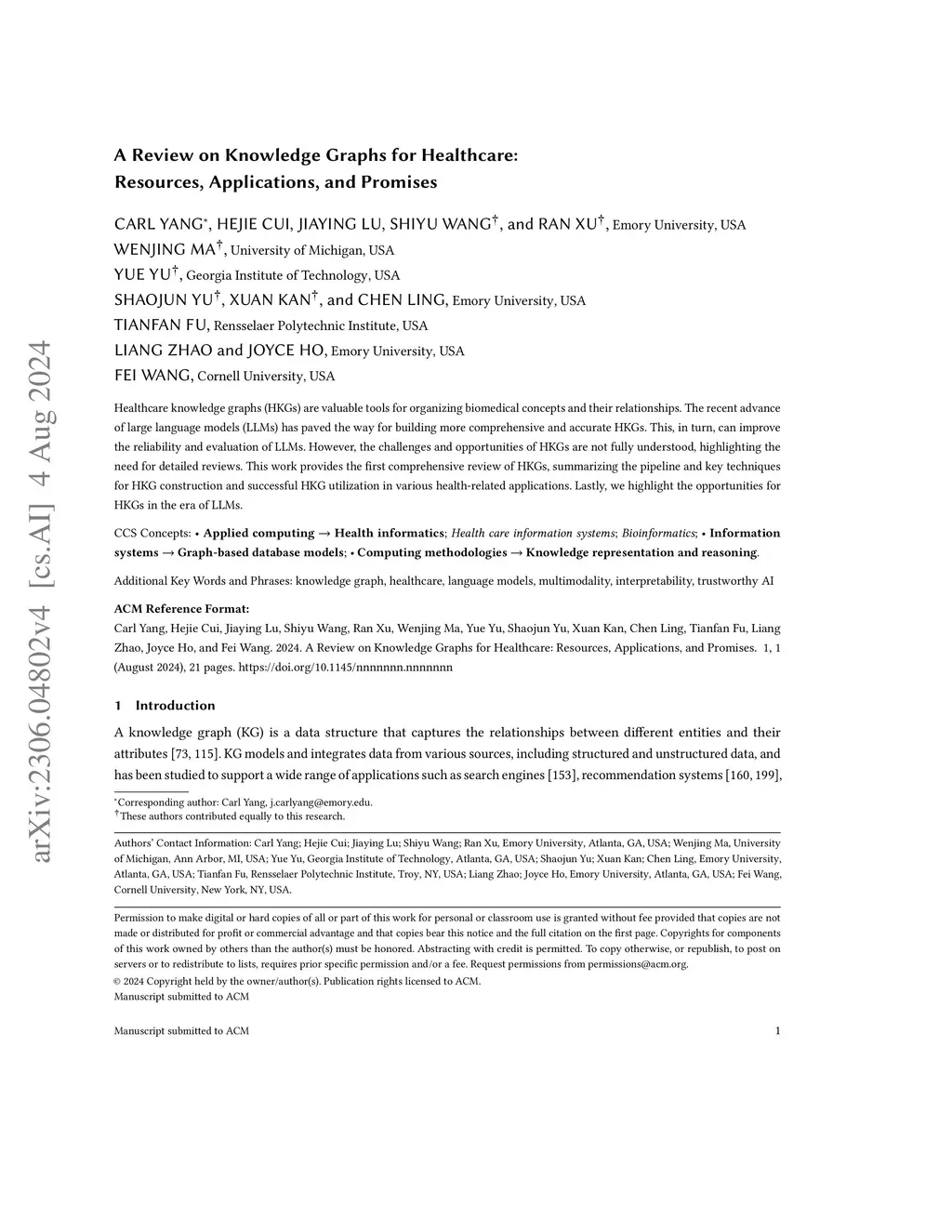 This comprehensive review aims to provide an overview of the current state of Healthcare Knowledge Graphs (HKGs), including their construction, utilization models, and applications across various healthcare and biomedical research domains. We thoroughly analyzed existing literature on HKGs, covering their construction methodologies, utilization techniques, and applications in basic science research, pharmaceutical research and development, clinical decision support, and public health. The review encompasses both model-free and model-based utilization approaches and the integration of HKGs with large language models (LLMs). We searched Google Scholar for relevant papers on HKGs and classified them into the following topics: HKG construction, HKG utilization, and their downstream applications in various domains. We also discussed their special challenges and the promise for future work. The review highlights the potential of HKGs to significantly impact biomedical research and clinical practice by integrating vast amounts of biomedical knowledge from multiple domains. The synergy between HKGs and LLMs offers promising opportunities for constructing more comprehensive knowledge graphs and improving the accuracy of healthcare applications. HKGs have emerged as a powerful tool for structuring medical knowledge, with broad applications across biomedical research, clinical decision-making, and public health. This survey serves as a roadmap for future research and development in the field of HKGs, highlighting the potential of combining knowledge graphs with advanced machine learning models for healthcare transformation.