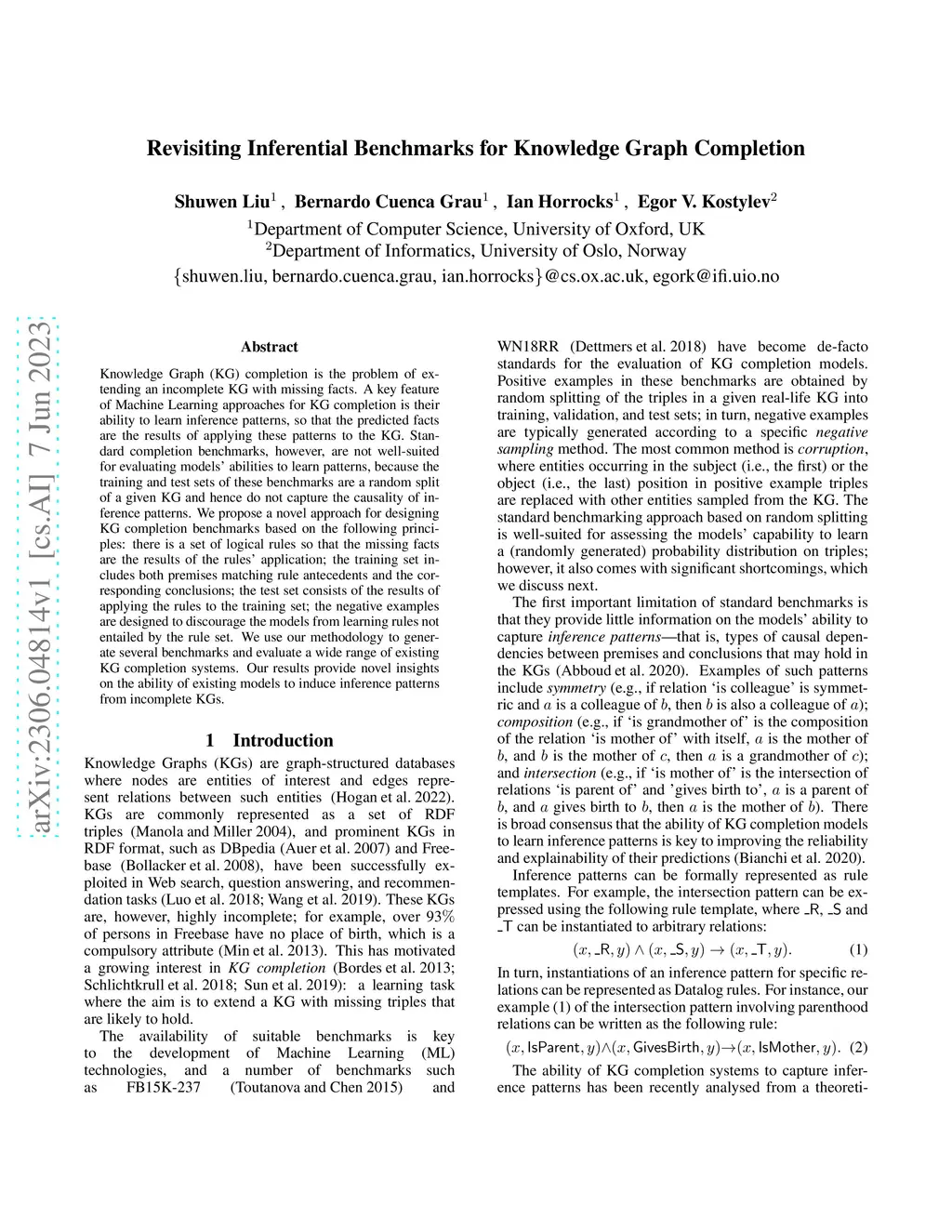 Knowledge Graph (KG) completion is the problem of extending an incomplete KG with missing facts. A key feature of Machine Learning approaches for KG completion is their ability to learn inference patterns, so that the predicted facts are the results of applying these patterns to the KG. Standard completion benchmarks, however, are not well-suited for evaluating models' abilities to learn patterns, because the training and test sets of these benchmarks are a random split of a given KG and hence do not capture the causality of inference patterns. We propose a novel approach for designing KG completion benchmarks based on the following principles: there is a set of logical rules so that the missing facts are the results of the rules' application; the training set includes both premises matching rule antecedents and the corresponding conclusions; the test set consists of the results of applying the rules to the training set; the negative examples are designed to discourage the models from learning rules not entailed by the rule set. We use our methodology to generate several benchmarks and evaluate a wide range of existing KG completion systems. Our results provide novel insights on the ability of existing models to induce inference patterns from incomplete KGs.