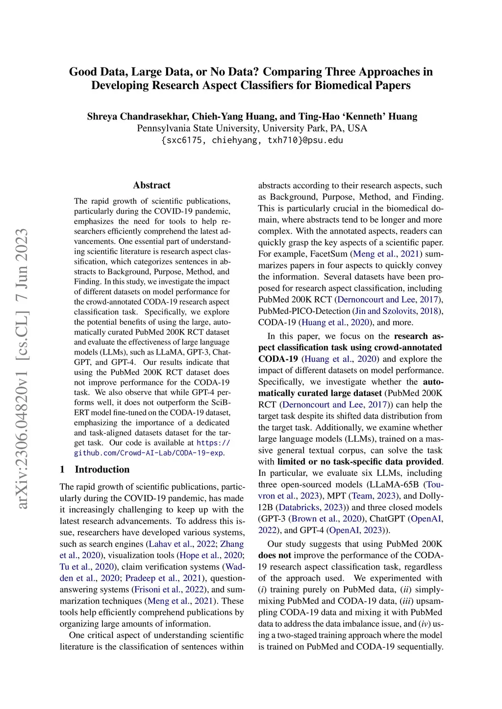 The rapid growth of scientific publications, particularly during the COVID-19 pandemic, emphasizes the need for tools to help researchers efficiently comprehend the latest advancements. One essential part of understanding scientific literature is research aspect classification, which categorizes sentences in abstracts to Background, Purpose, Method, and Finding. In this study, we investigate the impact of different datasets on model performance for the crowd-annotated CODA-19 research aspect classification task. Specifically, we explore the potential benefits of using the large, automatically curated PubMed 200K RCT dataset and evaluate the effectiveness of large language models (LLMs), such as LLaMA, GPT-3, ChatGPT, and GPT-4. Our results indicate that using the PubMed 200K RCT dataset does not improve performance for the CODA-19 task. We also observe that while GPT-4 performs well, it does not outperform the SciBERT model fine-tuned on the CODA-19 dataset, emphasizing the importance of a dedicated and task-aligned datasets dataset for the target task. Our code is available at https://github.com/Crowd-AI-Lab/CODA-19-exp.