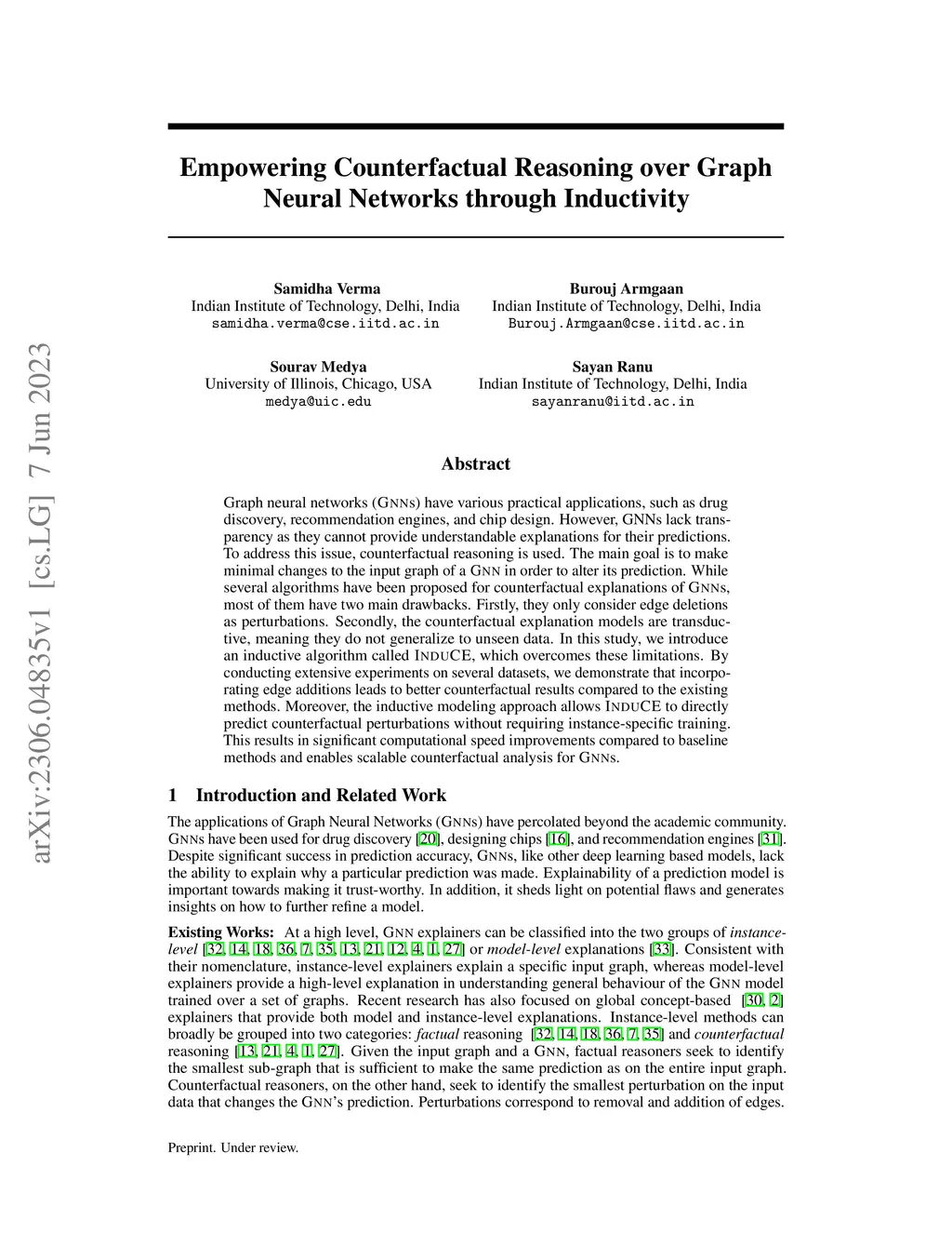 Graph neural networks (GNNs) have various practical applications, such as drug discovery, recommendation engines, and chip design. However, GNNs lack transparency as they cannot provide understandable explanations for their predictions. To address this issue, counterfactual reasoning is used. The main goal is to make minimal changes to the input graph of a GNN in order to alter its prediction. While several algorithms have been proposed for counterfactual explanations of GNNs, most of them have two main drawbacks. Firstly, they only consider edge deletions as perturbations. Secondly, the counterfactual explanation models are transductive, meaning they do not generalize to unseen data. In this study, we introduce an inductive algorithm called INDUCE, which overcomes these limitations. By conducting extensive experiments on several datasets, we demonstrate that incorporating edge additions leads to better counterfactual results compared to the existing methods. Moreover, the inductive modeling approach allows INDUCE to directly predict counterfactual perturbations without requiring instance-specific training. This results in significant computational speed improvements compared to baseline methods and enables scalable counterfactual analysis for GNNs.
