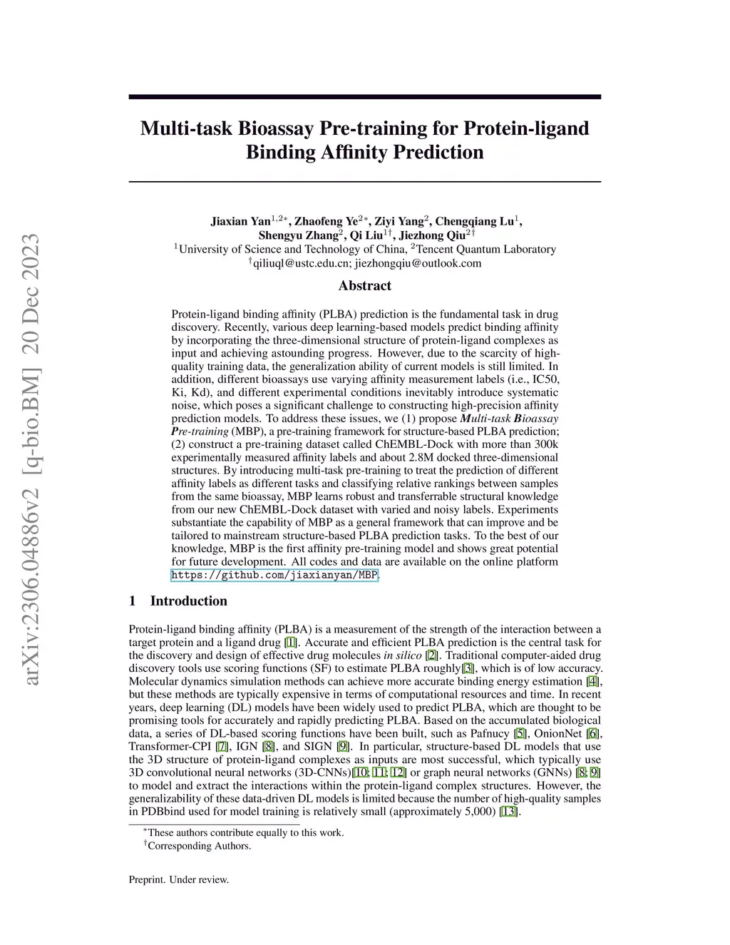 Protein-ligand binding affinity (PLBA) prediction is the fundamental task in drug discovery. Recently, various deep learning-based models predict binding affinity by incorporating the three-dimensional structure of protein-ligand complexes as input and achieving astounding progress. However, due to the scarcity of high-quality training data, the generalization ability of current models is still limited. In addition, different bioassays use varying affinity measurement labels (i.e., IC50, Ki, Kd), and different experimental conditions inevitably introduce systematic noise, which poses a significant challenge to constructing high-precision affinity prediction models. To address these issues, we (1) propose Multi-task Bioassay Pre-training (MBP), a pre-training framework for structure-based PLBA prediction; (2) construct a pre-training dataset called ChEMBL-Dock with more than 300k experimentally measured affinity labels and about 2.8M docked three-dimensional structures. By introducing multi-task pre-training to treat the prediction of different affinity labels as different tasks and classifying relative rankings between samples from the same bioassay, MBP learns robust and transferrable structural knowledge from our new ChEMBL-Dock dataset with varied and noisy labels. Experiments substantiate the capability of MBP as a general framework that can improve and be tailored to mainstream structure-based PLBA prediction tasks. To the best of our knowledge, MBP is the first affinity pre-training model and shows great potential for future development.