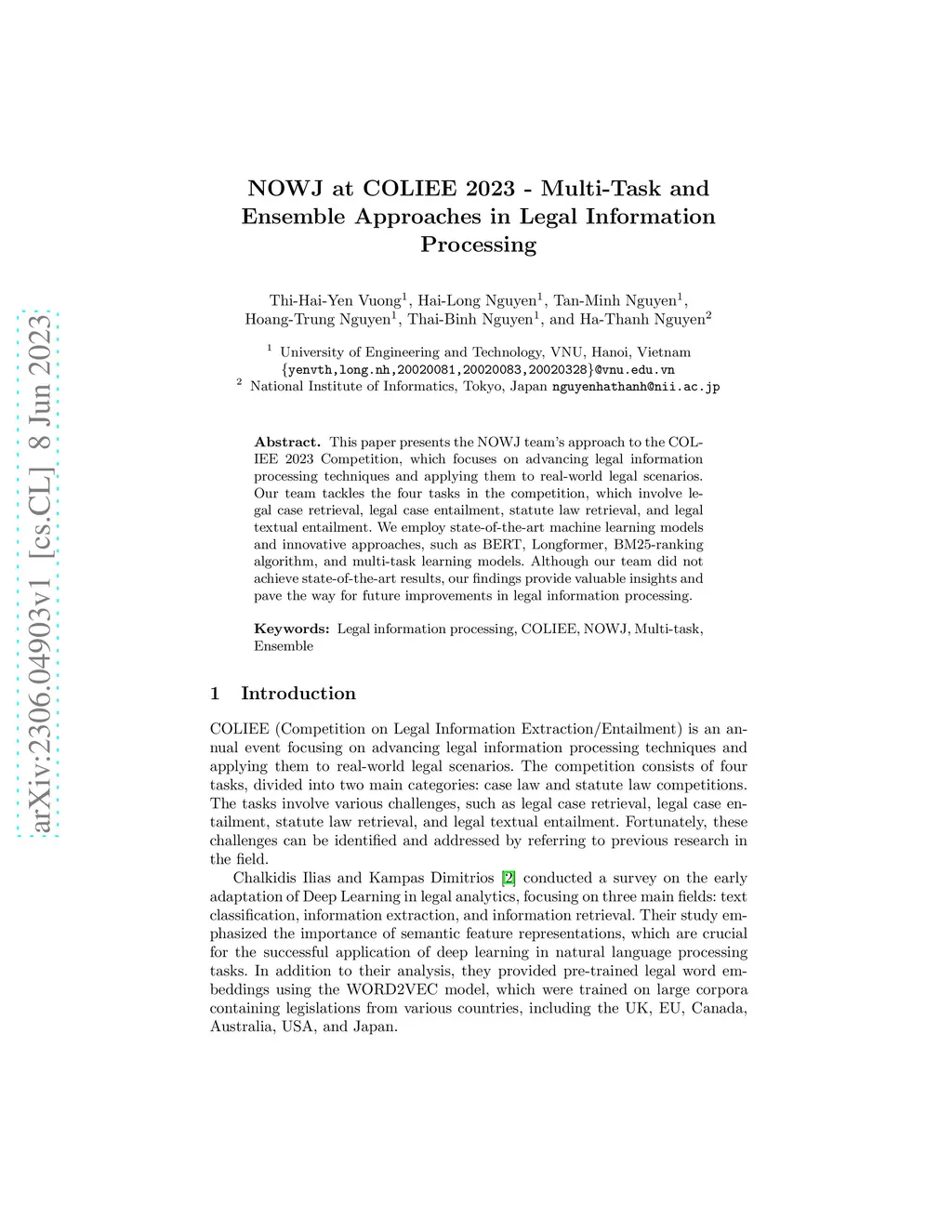 This paper presents the NOWJ team's approach to the COLIEE 2023 Competition, which focuses on advancing legal information processing techniques and applying them to real-world legal scenarios. Our team tackles the four tasks in the competition, which involve legal case retrieval, legal case entailment, statute law retrieval, and legal textual entailment. We employ state-of-the-art machine learning models and innovative approaches, such as BERT, Longformer, BM25-ranking algorithm, and multi-task learning models. Although our team did not achieve state-of-the-art results, our findings provide valuable insights and pave the way for future improvements in legal information processing.