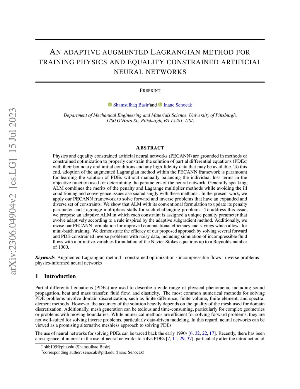 Physics and equality constrained artificial neural networks (PECANN) are grounded in methods of constrained optimization to properly constrain the solution of partial differential equations (PDEs) with their boundary and initial conditions and any high-fidelity data that may be available. To this end, adoption of the augmented Lagrangian method within the PECANN framework is paramount for learning the solution of PDEs without manually balancing the individual loss terms in the objective function used for determining the parameters of the neural network. Generally speaking, ALM combines the merits of the penalty and Lagrange multiplier methods while avoiding the ill conditioning and convergence issues associated singly with these methods . In the present work, we apply our PECANN framework to solve forward and inverse problems that have an expanded and diverse set of constraints. We show that ALM with its conventional formulation to update its penalty parameter and Lagrange multipliers stalls for such challenging problems. To address this issue, we propose an adaptive ALM in which each constraint is assigned a unique penalty parameter that evolve adaptively according to a rule inspired by the adaptive subgradient method. Additionally, we revise our PECANN formulation for improved computational efficiency and savings which allows for mini-batch training. We demonstrate the efficacy of our proposed approach by solving several forward and PDE-constrained inverse problems with noisy data, including simulation of incompressible fluid flows with a primitive-variables formulation of the Navier-Stokes equations up to a Reynolds number of 1000.