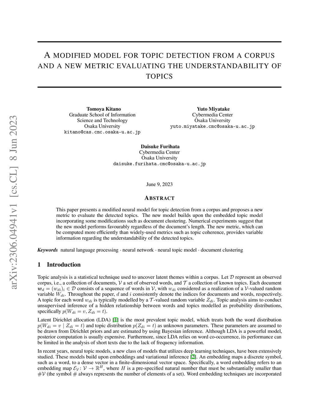This paper presents a modified neural model for topic detection from a corpus and proposes a new metric to evaluate the detected topics. The new model builds upon the embedded topic model incorporating some modifications such as document clustering. Numerical experiments suggest that the new model performs favourably regardless of the document's length. The new metric, which can be computed more efficiently than widely-used metrics such as topic coherence, provides variable information regarding the understandability of the detected topics.