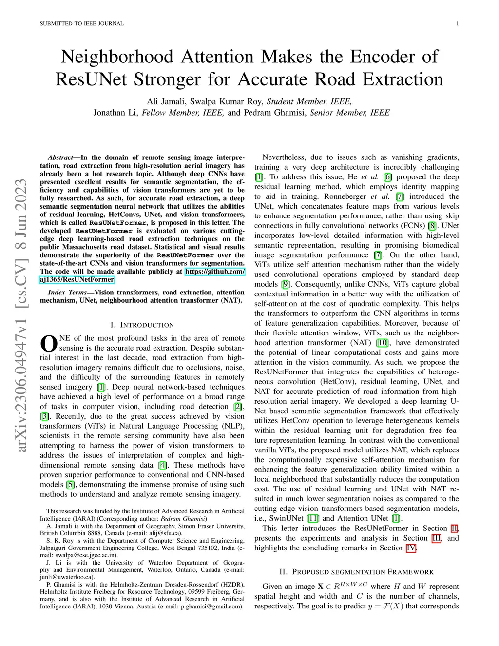 In the domain of remote sensing image interpretation, road extraction from high-resolution aerial imagery has already been a hot research topic. Although deep CNNs have presented excellent results for semantic segmentation, the efficiency and capabilities of vision transformers are yet to be fully researched. As such, for accurate road extraction, a deep semantic segmentation neural network that utilizes the abilities of residual learning, HetConvs, UNet, and vision transformers, which is called \texttt{ResUNetFormer}, is proposed in this letter. The developed \texttt{ResUNetFormer} is evaluated on various cutting-edge deep learning-based road extraction techniques on the public Massachusetts road dataset. Statistical and visual results demonstrate the superiority of the \texttt{ResUNetFormer} over the state-of-the-art CNNs and vision transformers for segmentation. The code will be made available publicly at \url{https://github.com/aj1365/ResUNetFormer}.