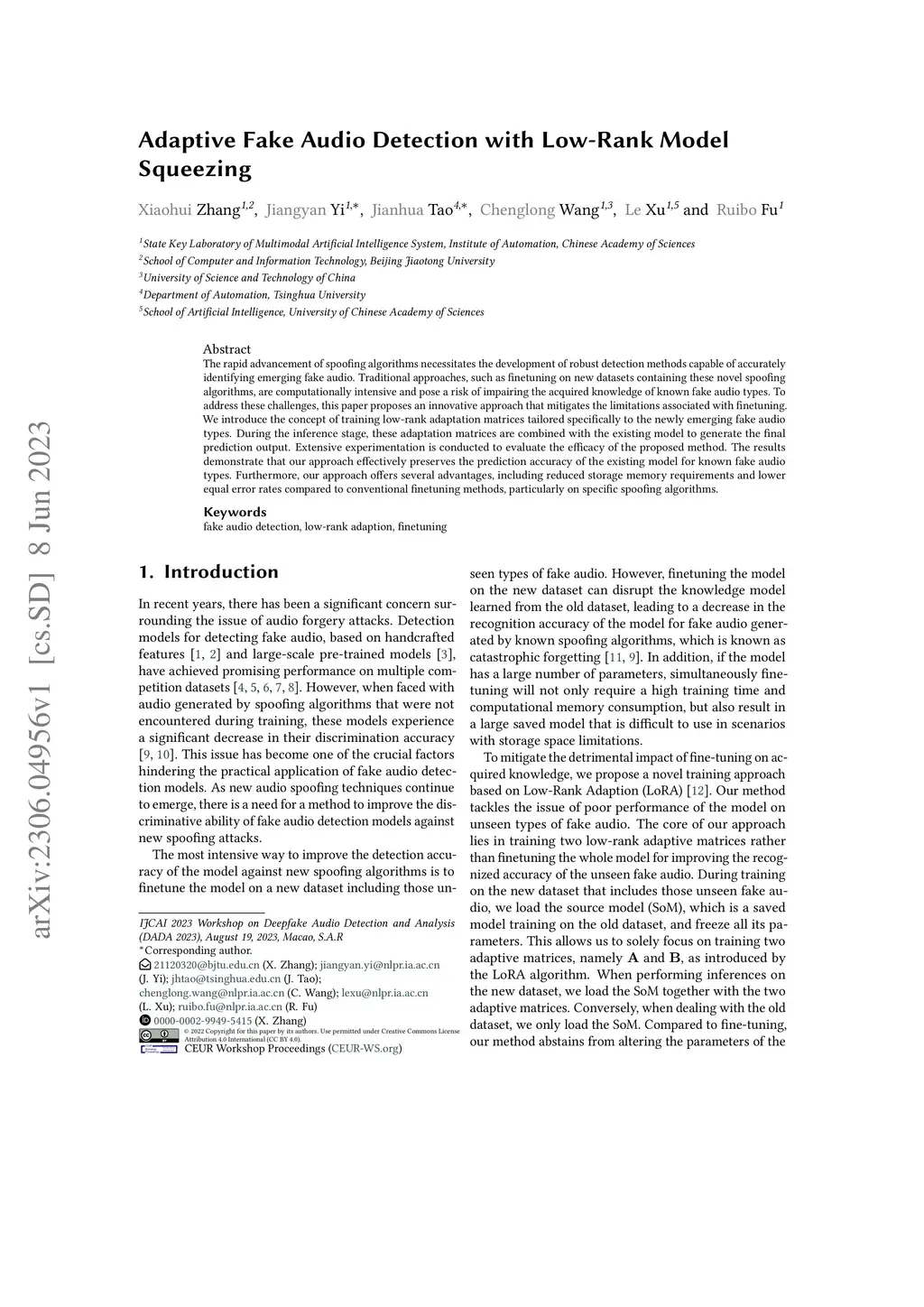 Adaptive Fake Audio Detection with Low-Rank Model Squeezing