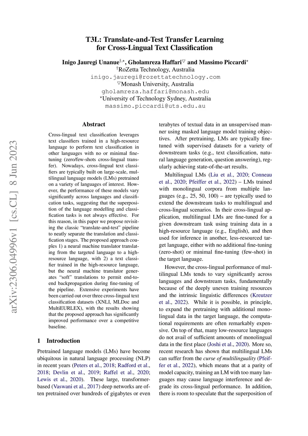 T3L: Translate-and-Test Transfer Learning for Cross-Lingual Text