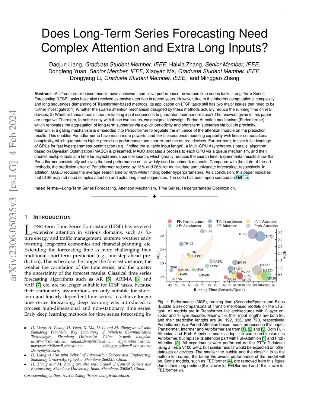 As Transformer-based models have achieved impressive performance on various time series tasks, Long-Term Series Forecasting (LTSF) tasks have also received extensive attention in recent years. However, due to the inherent computational complexity and long sequences demanding of Transformer-based methods, its application on LTSF tasks still has two major issues that need to be further investigated: 1) Whether the sparse attention mechanism designed by these methods actually reduce the running time on real devices; 2) Whether these models need extra long input sequences to guarantee their performance? The answers given in this paper are negative. Therefore, to better copy with these two issues, we design a lightweight Period-Attention mechanism (Periodformer), which renovates the aggregation of long-term subseries via explicit periodicity and short-term subseries via built-in proximity. Meanwhile, a gating mechanism is embedded into Periodformer to regulate the influence of the attention module on the prediction results. Furthermore, to take full advantage of GPUs for fast hyperparameter optimization (e.g., finding the suitable input length), a Multi-GPU Asynchronous parallel algorithm based on Bayesian Optimization (MABO) is presented. MABO allocates a process to each GPU via a queue mechanism, and then creates multiple trials at a time for asynchronous parallel search, which greatly reduces the search time. Compared with the state-of-the-art methods, the prediction error of Periodformer reduced by 13% and 26% for multivariate and univariate forecasting, respectively. In addition, MABO reduces the average search time by 46% while finding better hyperparameters. As a conclusion, this paper indicates that LTSF may not need complex attention and extra long input sequences. The code has been open sourced on Github.