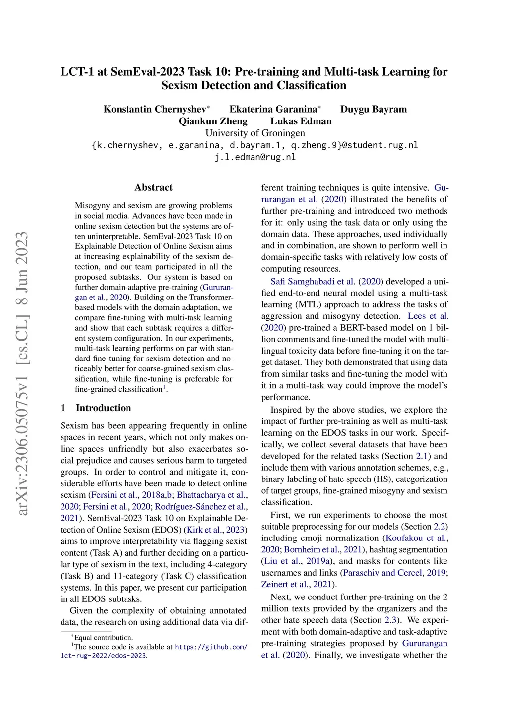 LCT-1 at SemEval-2023 Task 10: Pre-training and Multi-task Learning for
