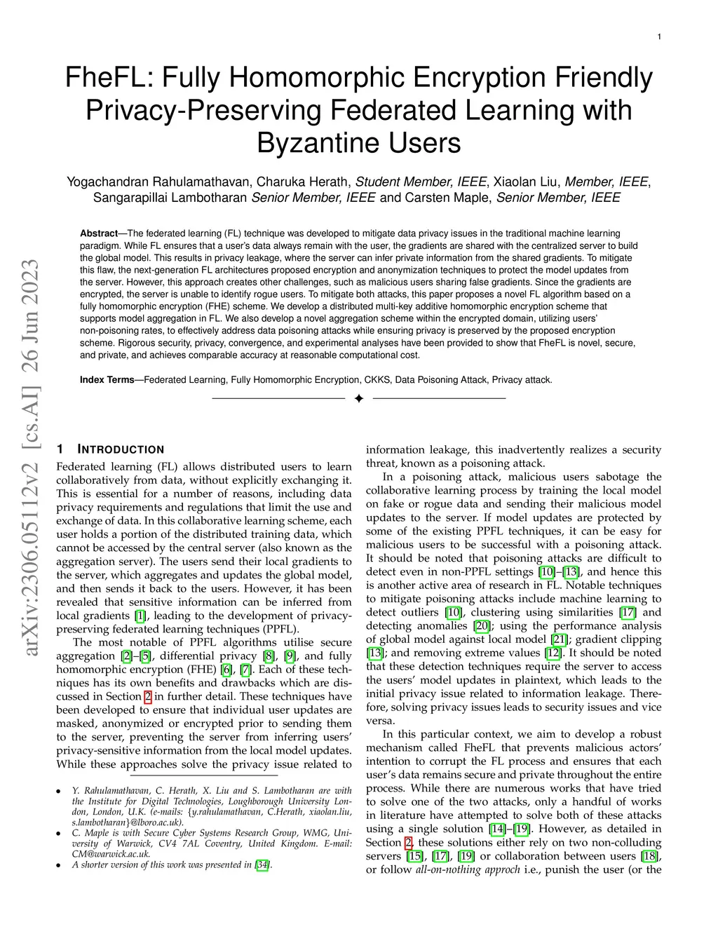 The federated learning (FL) technique was developed to mitigate data privacy issues in the traditional machine learning paradigm. While FL ensures that a user's data always remain with the user, the gradients are shared with the centralized server to build the global model. This results in privacy leakage, where the server can infer private information from the shared gradients. To mitigate this flaw, the next-generation FL architectures proposed encryption and anonymization techniques to protect the model updates from the server. However, this approach creates other challenges, such as malicious users sharing false gradients. Since the gradients are encrypted, the server is unable to identify rogue users. To mitigate both attacks, this paper proposes a novel FL algorithm based on a fully homomorphic encryption (FHE) scheme. We develop a distributed multi-key additive homomorphic encryption scheme that supports model aggregation in FL. We also develop a novel aggregation scheme within the encrypted domain, utilizing users' non-poisoning rates, to effectively address data poisoning attacks while ensuring privacy is preserved by the proposed encryption scheme. Rigorous security, privacy, convergence, and experimental analyses have been provided to show that FheFL is novel, secure, and private, and achieves comparable accuracy at reasonable computational cost.