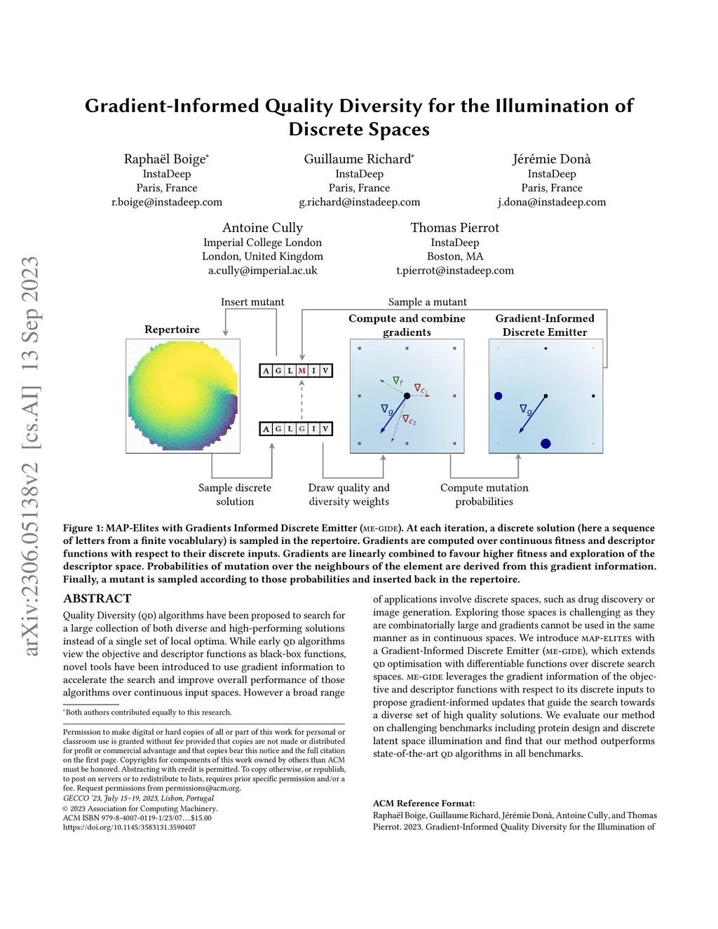Quality Diversity (QD) algorithms have been proposed to search for a large collection of both diverse and high-performing solutions instead of a single set of local optima. While early QD algorithms view the objective and descriptor functions as black-box functions, novel tools have been introduced to use gradient information to accelerate the search and improve overall performance of those algorithms over continuous input spaces. However a broad range of applications involve discrete spaces, such as drug discovery or image generation. Exploring those spaces is challenging as they are combinatorially large and gradients cannot be used in the same manner as in continuous spaces. We introduce map-elites with a Gradient-Informed Discrete Emitter (ME-GIDE), which extends QD optimisation with differentiable functions over discrete search spaces. ME-GIDE leverages the gradient information of the objective and descriptor functions with respect to its discrete inputs to propose gradient-informed updates that guide the search towards a diverse set of high quality solutions. We evaluate our method on challenging benchmarks including protein design and discrete latent space illumination and find that our method outperforms state-of-the-art QD algorithms in all benchmarks.