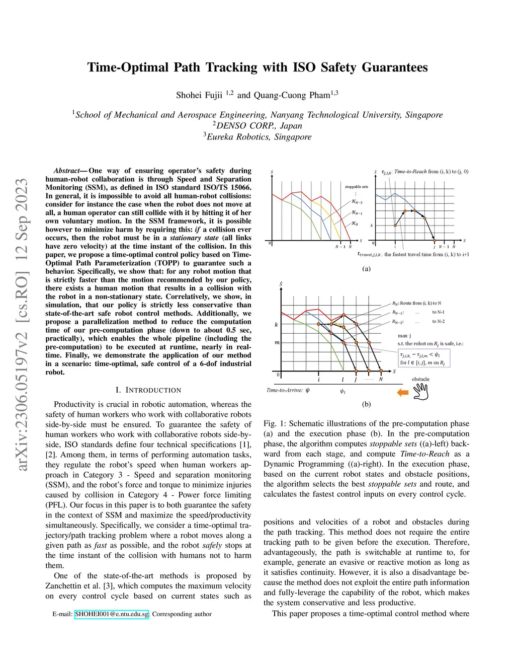 One way of ensuring operator's safety during human-robot collaboration is through Speed and Separation Monitoring (SSM), as defined in ISO standard ISO/TS 15066. In general, it is impossible to avoid all human-robot collisions: consider for instance the case when the robot does not move at all, a human operator can still collide with it by hitting it of her own voluntary motion. In the SSM framework, it is possible however to minimize harm by requiring this: \emph{if} a collision ever occurs, then the robot must be in a \emph{stationary state} (all links have zero velocity) at the time instant of the collision. In this paper, we propose a time-optimal control policy based on Time-Optimal Path Parameterization (TOPP) to guarantee such a behavior. Specifically, we show that: for any robot motion that is strictly faster than the motion recommended by our policy, there exists a human motion that results in a collision with the robot in a non-stationary state. Correlatively, we show, in simulation, that our policy is strictly less conservative than state-of-the-art safe robot control methods. Additionally, we propose a parallelization method to reduce the computation time of our pre-computation phase (down to 0.5 sec, practically), which enables the whole pipeline (including the pre-computation) to be executed at runtime, nearly in real-time. Finally, we demonstrate the application of our method in a scenario: time-optimal, safe control of a 6-dof industrial robot.