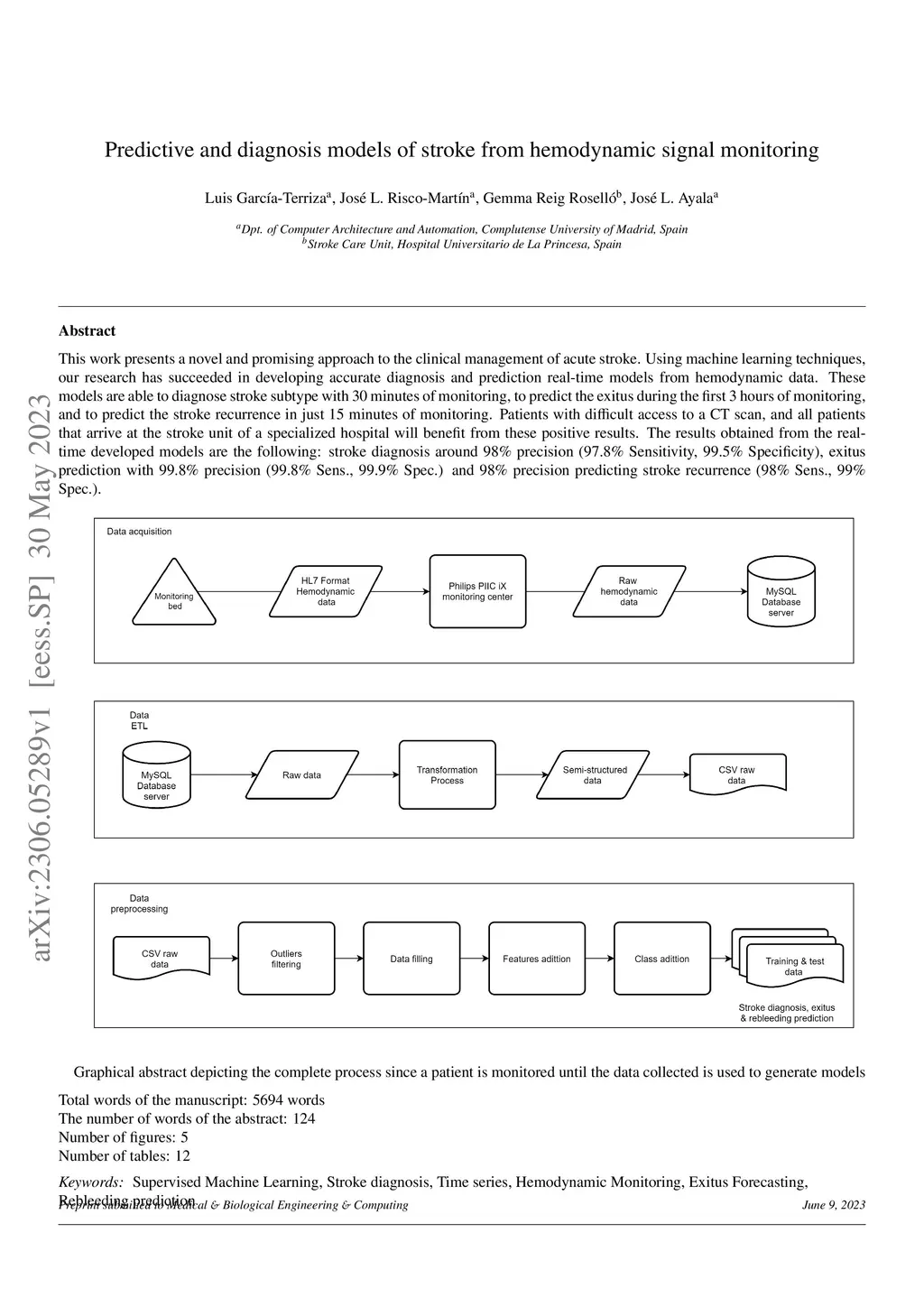 This work presents a novel and promising approach to the clinical management of acute stroke. Using machine learning techniques, our research has succeeded in developing accurate diagnosis and prediction real-time models from hemodynamic data. These models are able to diagnose stroke subtype with 30 minutes of monitoring, to predict the exitus during the first 3 hours of monitoring, and to predict the stroke recurrence in just 15 minutes of monitoring. Patients with difficult access to a \acrshort{CT} scan, and all patients that arrive at the stroke unit of a specialized hospital will benefit from these positive results. The results obtained from the real-time developed models are the following: stroke diagnosis around precision ( Sensitivity, Specificity), exitus prediction with precision ( Sens., Spec.) and precision predicting stroke recurrence ( Sens., Spec.).