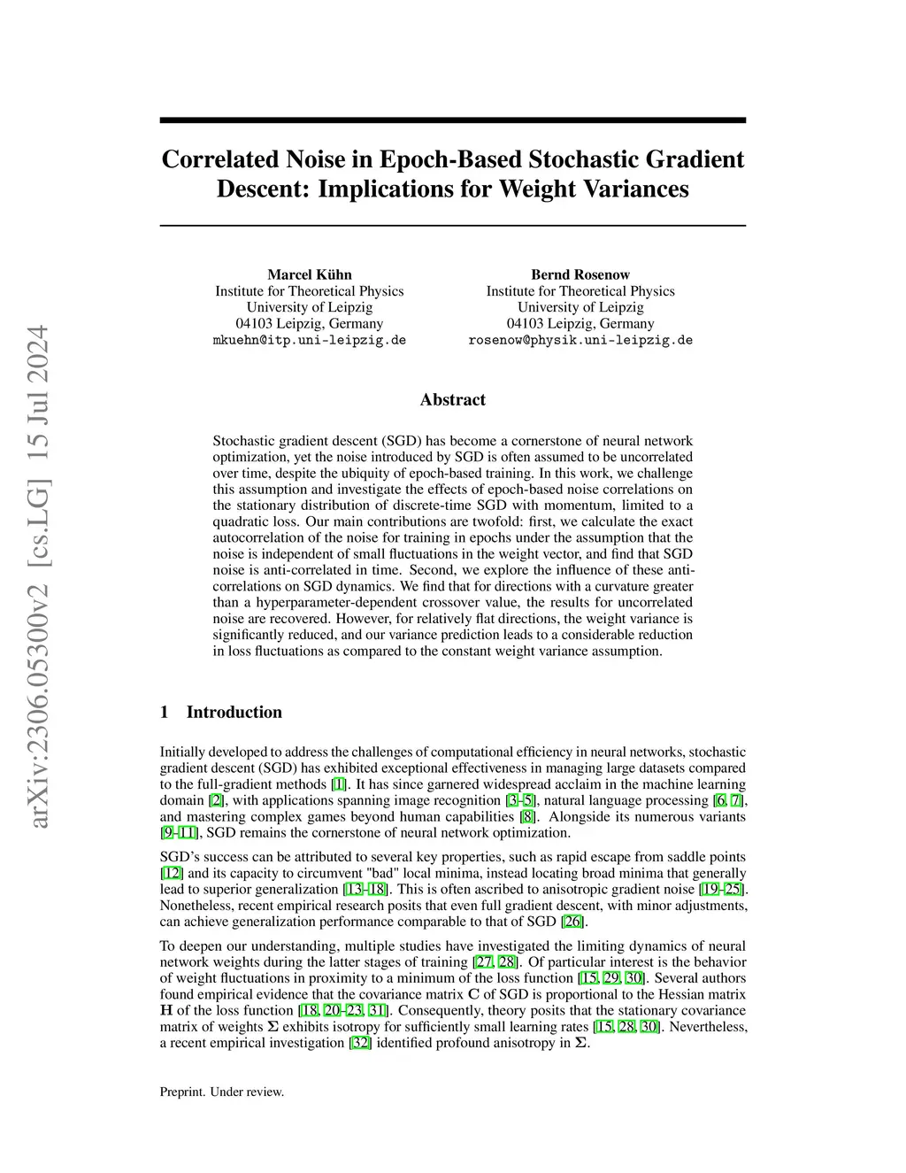 Stochastic Gradient Descent (SGD) has become a cornerstone of neural network optimization due to its computational efficiency and generalization capabilities. However, the gradient noise introduced by SGD is often assumed to be uncorrelated over time, despite the common practice of epoch-based training where data is sampled without replacement. In this work, we challenge this assumption and investigate the effects of epoch-based noise correlations on the stationary distribution of discrete-time SGD with momentum. Our main contributions are twofold: First, we calculate the exact autocorrelation of the noise during epoch-based training under the assumption that the noise is independent of small fluctuations in the weight vector, revealing that SGD noise is inherently anti-correlated over time. Second, we explore the influence of these anti-correlations on the variance of weight fluctuations. We find that for directions with curvature of the loss greater than a hyperparameter-dependent crossover value, the conventional predictions of isotropic weight variance under stationarity, based on uncorrelated and curvature-proportional noise, are recovered. Anti-correlations have negligible effect here. However, for relatively flat directions, the weight variance is significantly reduced, leading to a considerable decrease in loss fluctuations compared to the constant weight variance assumption. Furthermore, we present a numerical experiment where training with these anti-correlations enhances test performance, suggesting that the inherent noise structure induced by epoch-based training may play a role in finding flatter minima that generalize better.