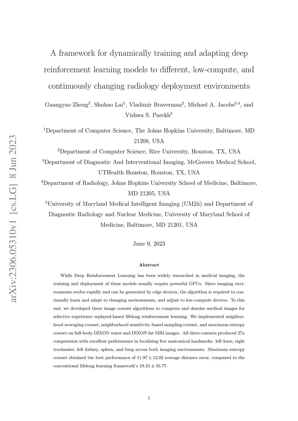 While Deep Reinforcement Learning has been widely researched in medical imaging, the training and deployment of these models usually require powerful GPUs. Since imaging environments evolve rapidly and can be generated by edge devices, the algorithm is required to continually learn and adapt to changing environments, and adjust to low-compute devices. To this end, we developed three image coreset algorithms to compress and denoise medical images for selective experience replayed-based lifelong reinforcement learning. We implemented neighborhood averaging coreset, neighborhood sensitivity-based sampling coreset, and maximum entropy coreset on full-body DIXON water and DIXON fat MRI images. All three coresets produced 27x compression with excellent performance in localizing five anatomical landmarks: left knee, right trochanter, left kidney, spleen, and lung across both imaging environments. Maximum entropy coreset obtained the best performance of average distance error, compared to the conventional lifelong learning framework's .