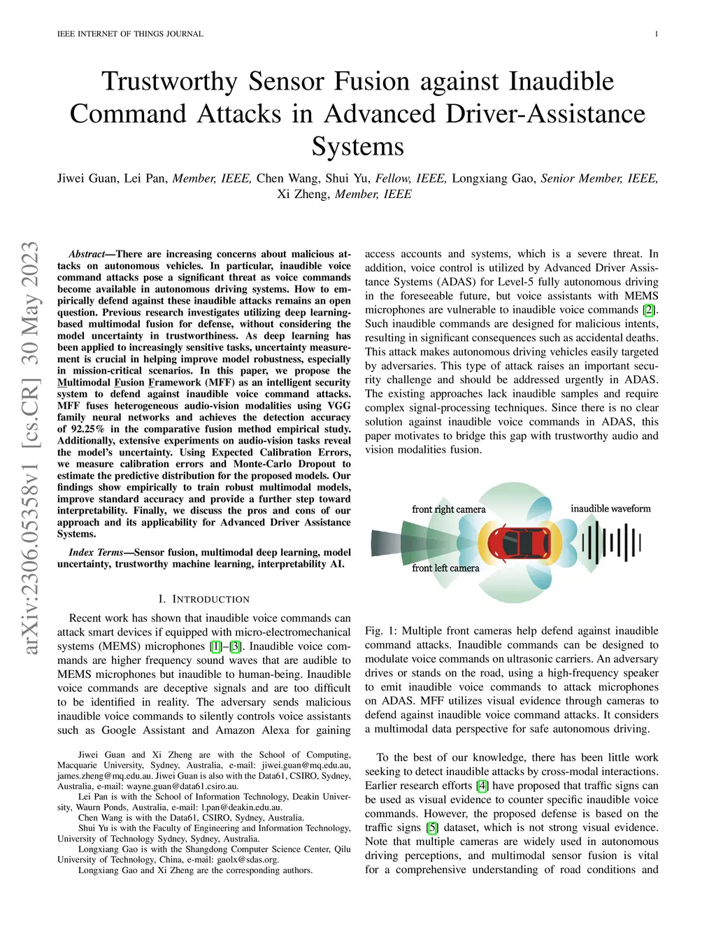 There are increasing concerns about malicious attacks on autonomous vehicles. In particular, inaudible voice command attacks pose a significant threat as voice commands become available in autonomous driving systems. How to empirically defend against these inaudible attacks remains an open question. Previous research investigates utilizing deep learning-based multimodal fusion for defense, without considering the model uncertainty in trustworthiness. As deep learning has been applied to increasingly sensitive tasks, uncertainty measurement is crucial in helping improve model robustness, especially in mission-critical scenarios. In this paper, we propose the Multimodal Fusion Framework (MFF) as an intelligent security system to defend against inaudible voice command attacks. MFF fuses heterogeneous audio-vision modalities using VGG family neural networks and achieves the detection accuracy of 92.25% in the comparative fusion method empirical study. Additionally, extensive experiments on audio-vision tasks reveal the model's uncertainty. Using Expected Calibration Errors, we measure calibration errors and Monte-Carlo Dropout to estimate the predictive distribution for the proposed models. Our findings show empirically to train robust multimodal models, improve standard accuracy and provide a further step toward interpretability. Finally, we discuss the pros and cons of our approach and its applicability for Advanced Driver Assistance Systems.