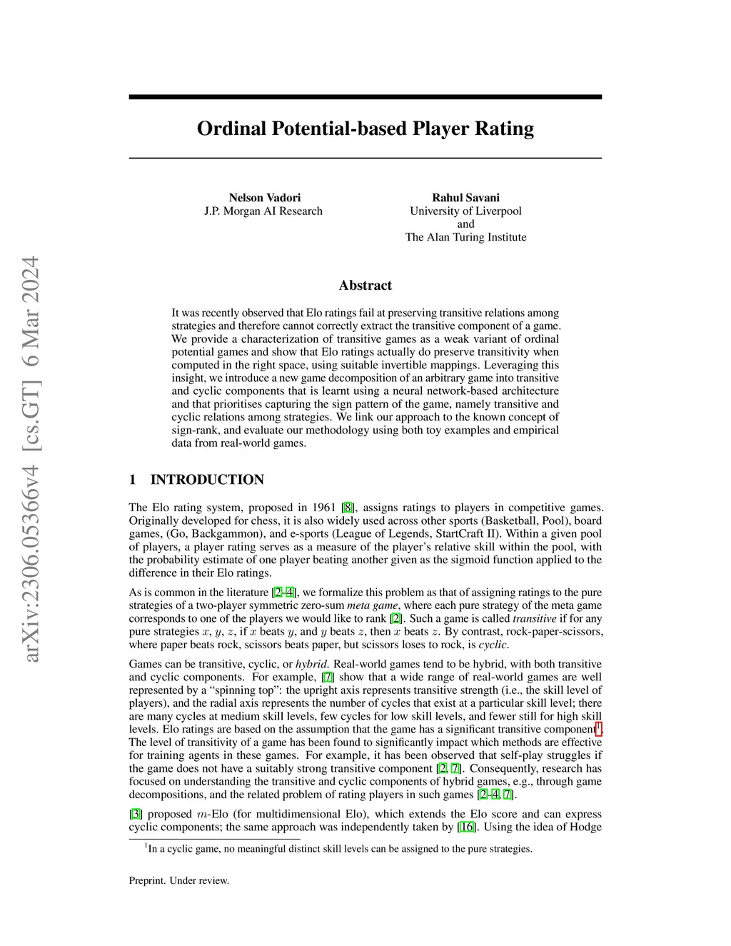 Ordinal Potential-based Player Rating