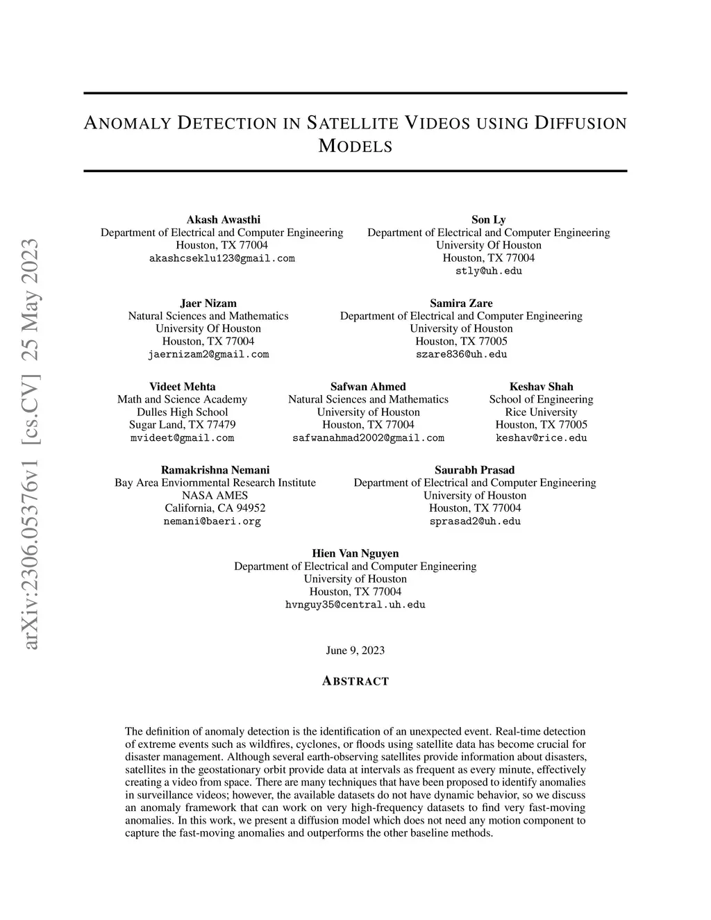 The definition of anomaly detection is the identification of an unexpected event. Real-time detection of extreme events such as wildfires, cyclones, or floods using satellite data has become crucial for disaster management. Although several earth-observing satellites provide information about disasters, satellites in the geostationary orbit provide data at intervals as frequent as every minute, effectively creating a video from space. There are many techniques that have been proposed to identify anomalies in surveillance videos; however, the available datasets do not have dynamic behavior, so we discuss an anomaly framework that can work on very high-frequency datasets to find very fast-moving anomalies. In this work, we present a diffusion model which does not need any motion component to capture the fast-moving anomalies and outperforms the other baseline methods.