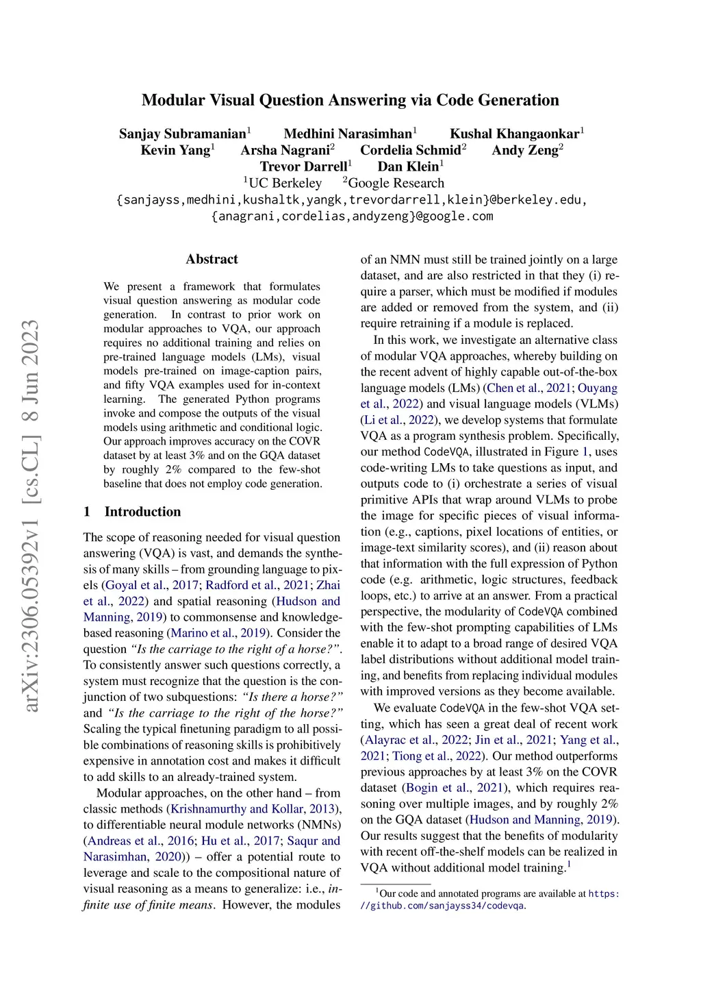 Modular Visual Question Answering via Code Generation