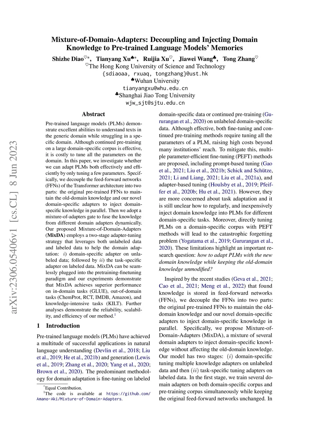 Pre-trained language models (PLMs) demonstrate excellent abilities to understand texts in the generic domain while struggling in a specific domain. Although continued pre-training on a large domain-specific corpus is effective, it is costly to tune all the parameters on the domain. In this paper, we investigate whether we can adapt PLMs both effectively and efficiently by only tuning a few parameters. Specifically, we decouple the feed-forward networks (FFNs) of the Transformer architecture into two parts: the original pre-trained FFNs to maintain the old-domain knowledge and our novel domain-specific adapters to inject domain-specific knowledge in parallel. Then we adopt a mixture-of-adapters gate to fuse the knowledge from different domain adapters dynamically. Our proposed Mixture-of-Domain-Adapters (MixDA) employs a two-stage adapter-tuning strategy that leverages both unlabeled data and labeled data to help the domain adaptation: i) domain-specific adapter on unlabeled data; followed by ii) the task-specific adapter on labeled data. MixDA can be seamlessly plugged into the pretraining-finetuning paradigm and our experiments demonstrate that MixDA achieves superior performance on in-domain tasks (GLUE), out-of-domain tasks (ChemProt, RCT, IMDB, Amazon), and knowledge-intensive tasks (KILT). Further analyses demonstrate the reliability, scalability, and efficiency of our method. The code is available at https://github.com/Amano-Aki/Mixture-of-Domain-Adapters.