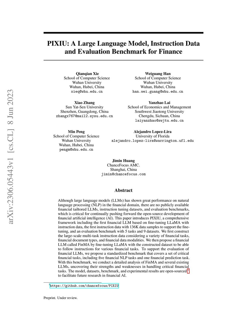 Although large language models (LLMs) has shown great performance on natural language processing (NLP) in the financial domain, there are no publicly available financial tailtored LLMs, instruction tuning datasets, and evaluation benchmarks, which is critical for continually pushing forward the open-source development of financial artificial intelligence (AI). This paper introduces PIXIU, a comprehensive framework including the first financial LLM based on fine-tuning LLaMA with instruction data, the first instruction data with 136K data samples to support the fine-tuning, and an evaluation benchmark with 5 tasks and 9 datasets. We first construct the large-scale multi-task instruction data considering a variety of financial tasks, financial document types, and financial data modalities. We then propose a financial LLM called FinMA by fine-tuning LLaMA with the constructed dataset to be able to follow instructions for various financial tasks. To support the evaluation of financial LLMs, we propose a standardized benchmark that covers a set of critical financial tasks, including five financial NLP tasks and one financial prediction task. With this benchmark, we conduct a detailed analysis of FinMA and several existing LLMs, uncovering their strengths and weaknesses in handling critical financial tasks. The model, datasets, benchmark, and experimental results are open-sourced to facilitate future research in financial AI.