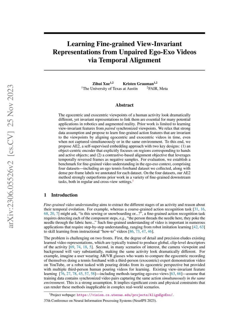 The egocentric and exocentric viewpoints of a human activity look dramatically different, yet invariant representations to link them are essential for many potential applications in robotics and augmented reality. Prior work is limited to learning view-invariant features from paired synchronized viewpoints. We relax that strong data assumption and propose to learn fine-grained action features that are invariant to the viewpoints by aligning egocentric and exocentric videos in time, even when not captured simultaneously or in the same environment. To this end, we propose AE2, a self-supervised embedding approach with two key designs: (1) an object-centric encoder that explicitly focuses on regions corresponding to hands and active objects; and (2) a contrastive-based alignment objective that leverages temporally reversed frames as negative samples. For evaluation, we establish a benchmark for fine-grained video understanding in the ego-exo context, comprising four datasets -- including an ego tennis forehand dataset we collected, along with dense per-frame labels we annotated for each dataset. On the four datasets, our AE2 method strongly outperforms prior work in a variety of fine-grained downstream tasks, both in regular and cross-view settings.