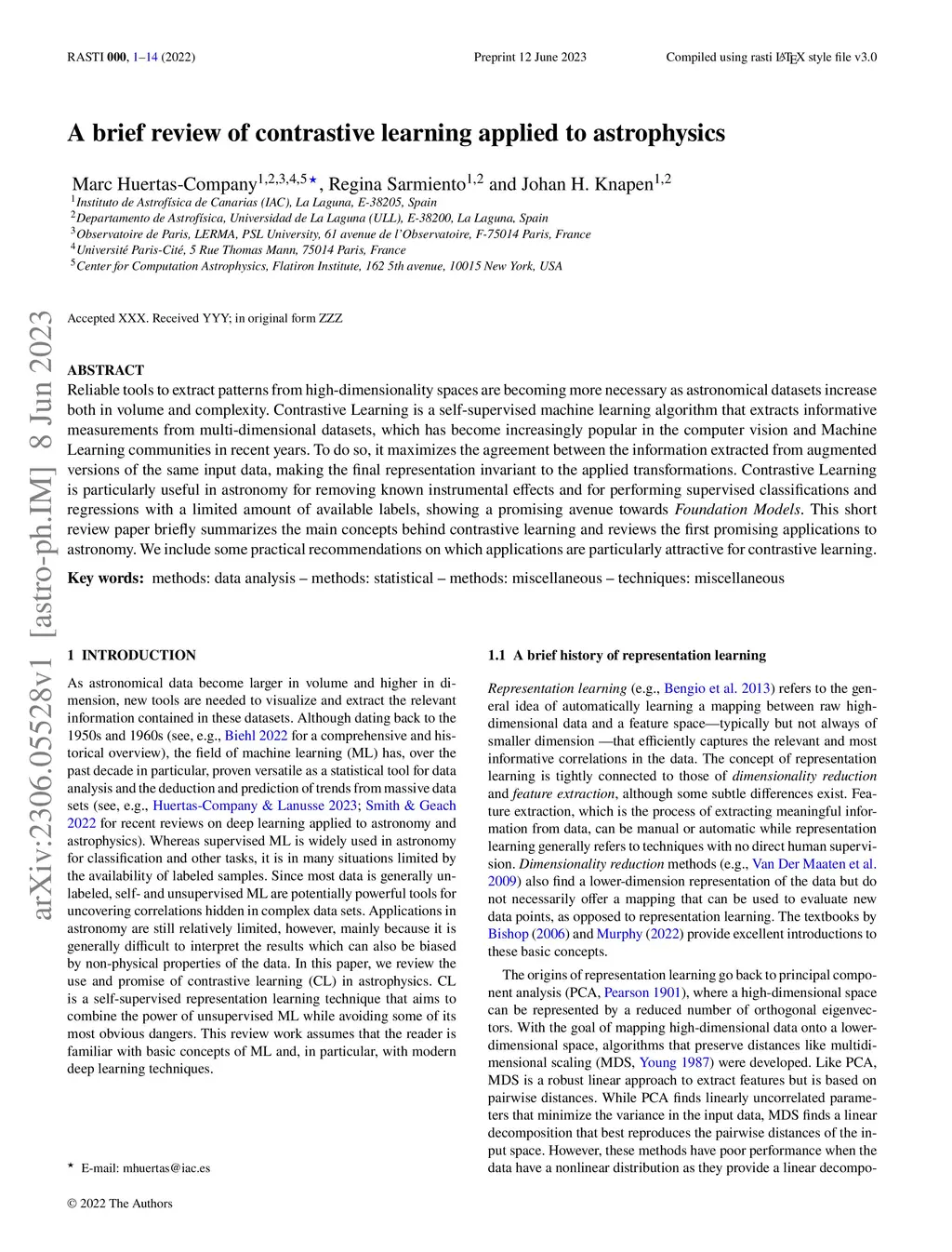 Reliable tools to extract patterns from high-dimensionality spaces are becoming more necessary as astronomical datasets increase both in volume and complexity. Contrastive Learning is a self-supervised machine learning algorithm that extracts informative measurements from multi-dimensional datasets, which has become increasingly popular in the computer vision and Machine Learning communities in recent years. To do so, it maximizes the agreement between the information extracted from augmented versions of the same input data, making the final representation invariant to the applied transformations. Contrastive Learning is particularly useful in astronomy for removing known instrumental effects and for performing supervised classifications and regressions with a limited amount of available labels, showing a promising avenue towards \emph{Foundation Models}. This short review paper briefly summarizes the main concepts behind contrastive learning and reviews the first promising applications to astronomy. We include some practical recommendations on which applications are particularly attractive for contrastive learning.