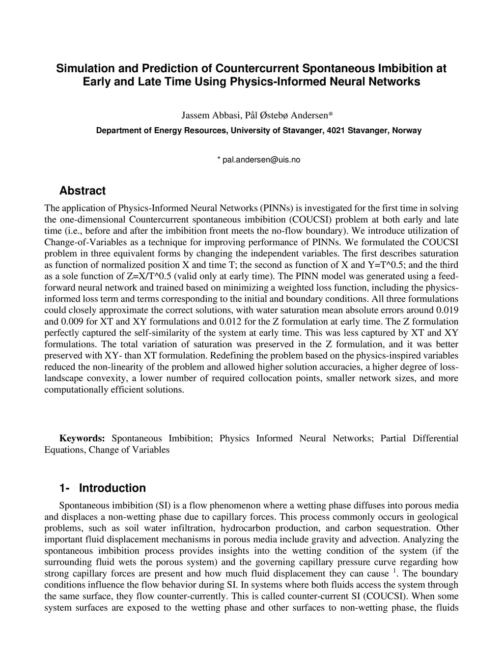 The application of Physics-Informed Neural Networks (PINNs) is investigated for the first time in solving the one-dimensional Countercurrent spontaneous imbibition (COUCSI) problem at both early and late time (i.e., before and after the imbibition front meets the no-flow boundary). We introduce utilization of Change-of-Variables as a technique for improving performance of PINNs. We formulated the COUCSI problem in three equivalent forms by changing the independent variables. The first describes saturation as function of normalized position X and time T; the second as function of X and Y=T^0.5; and the third as a sole function of Z=X/T^0.5 (valid only at early time). The PINN model was generated using a feed-forward neural network and trained based on minimizing a weighted loss function, including the physics-informed loss term and terms corresponding to the initial and boundary conditions. All three formulations could closely approximate the correct solutions, with water saturation mean absolute errors around 0.019 and 0.009 for XT and XY formulations and 0.012 for the Z formulation at early time. The Z formulation perfectly captured the self-similarity of the system at early time. This was less captured by XT and XY formulations. The total variation of saturation was preserved in the Z formulation, and it was better preserved with XY- than XT formulation. Redefining the problem based on the physics-inspired variables reduced the non-linearity of the problem and allowed higher solution accuracies, a higher degree of loss-landscape convexity, a lower number of required collocation points, smaller network sizes, and more computationally efficient solutions.