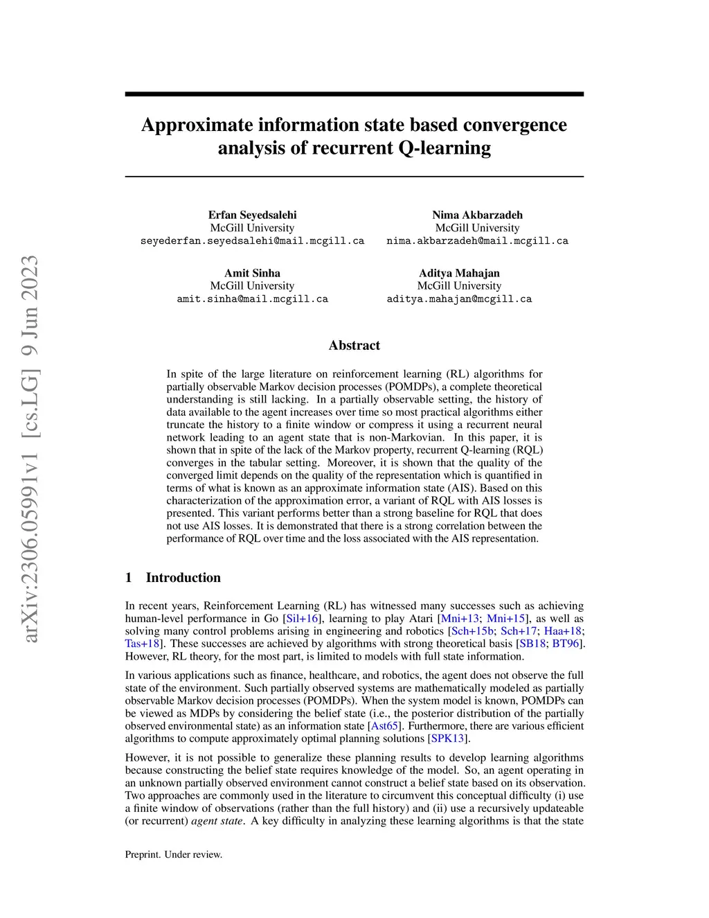In spite of the large literature on reinforcement learning (RL) algorithms for partially observable Markov decision processes (POMDPs), a complete theoretical understanding is still lacking. In a partially observable setting, the history of data available to the agent increases over time so most practical algorithms either truncate the history to a finite window or compress it using a recurrent neural network leading to an agent state that is non-Markovian. In this paper, it is shown that in spite of the lack of the Markov property, recurrent Q-learning (RQL) converges in the tabular setting. Moreover, it is shown that the quality of the converged limit depends on the quality of the representation which is quantified in terms of what is known as an approximate information state (AIS). Based on this characterization of the approximation error, a variant of RQL with AIS losses is presented. This variant performs better than a strong baseline for RQL that does not use AIS losses. It is demonstrated that there is a strong correlation between the performance of RQL over time and the loss associated with the AIS representation.