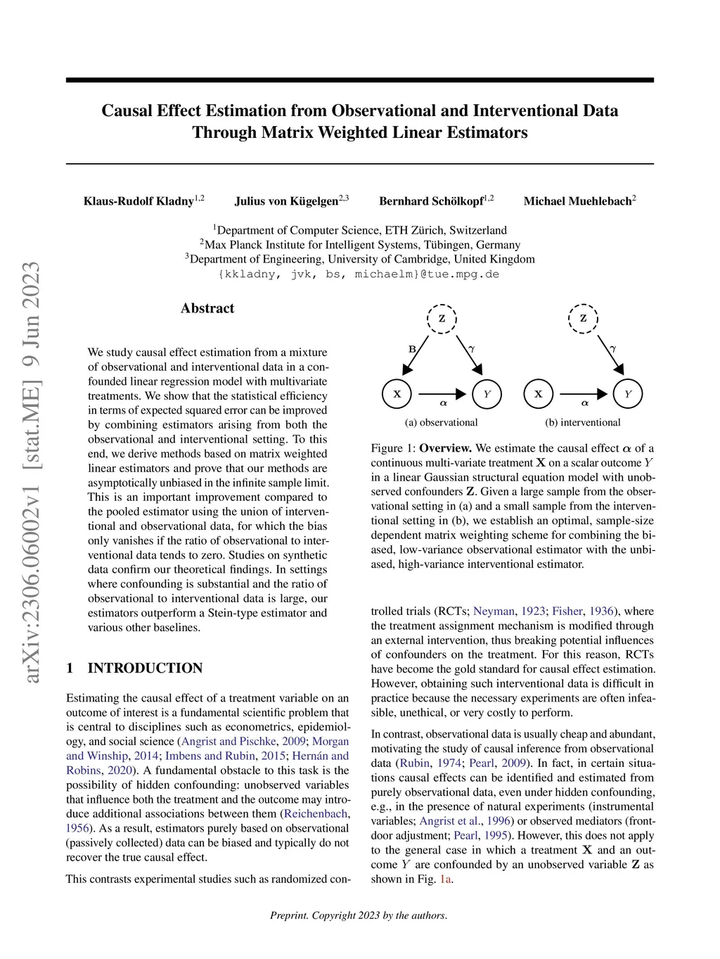 We study causal effect estimation from a mixture of observational and interventional data in a confounded linear regression model with multivariate treatments. We show that the statistical efficiency in terms of expected squared error can be improved by combining estimators arising from both the observational and interventional setting. To this end, we derive methods based on matrix weighted linear estimators and prove that our methods are asymptotically unbiased in the infinite sample limit. This is an important improvement compared to the pooled estimator using the union of interventional and observational data, for which the bias only vanishes if the ratio of observational to interventional data tends to zero. Studies on synthetic data confirm our theoretical findings. In settings where confounding is substantial and the ratio of observational to interventional data is large, our estimators outperform a Stein-type estimator and various other baselines.