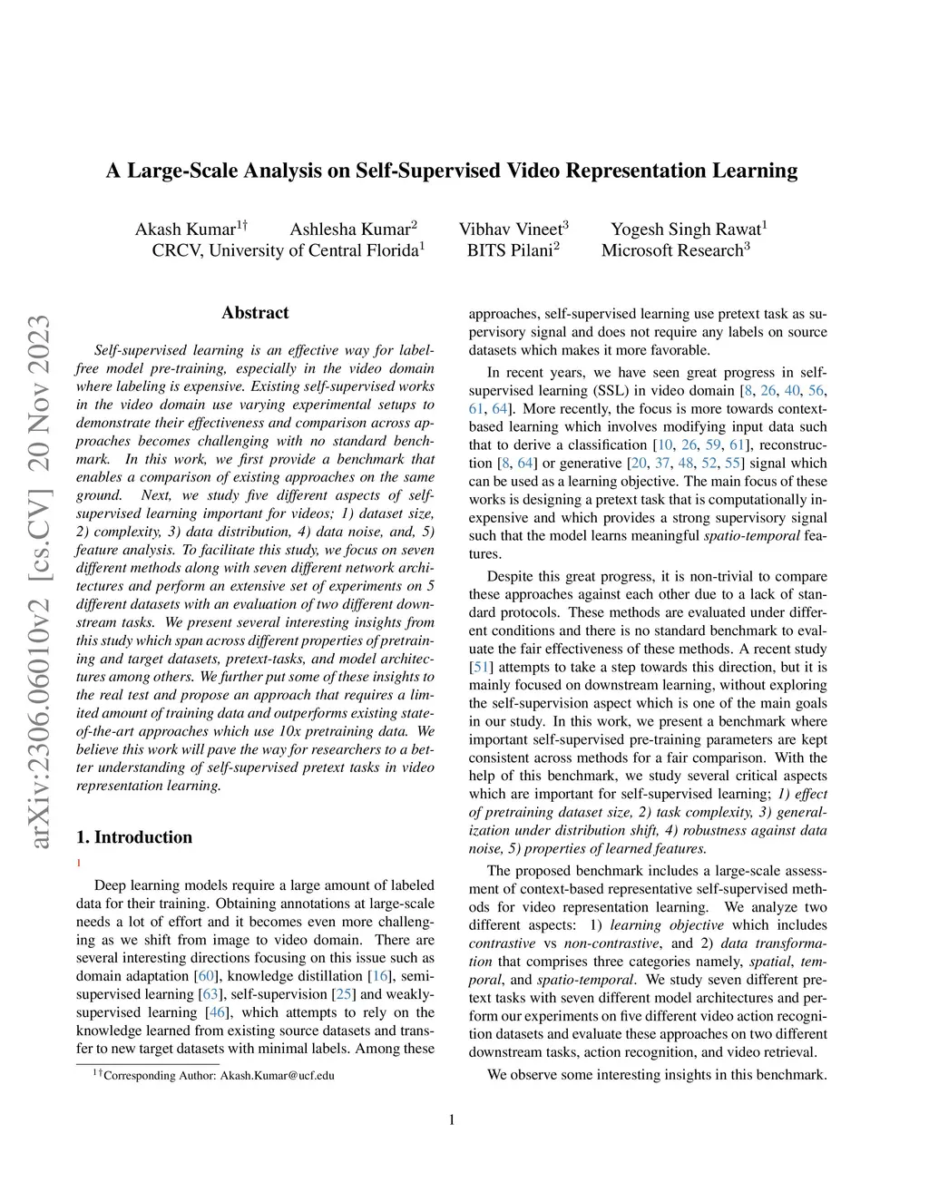 Self-supervised learning is an effective way for label-free model pre-training, especially in the video domain where labeling is expensive. Existing self-supervised works in the video domain use varying experimental setups to demonstrate their effectiveness and comparison across approaches becomes challenging with no standard benchmark. In this work, we first provide a benchmark that enables a comparison of existing approaches on the same ground. Next, we study five different aspects of self-supervised learning important for videos; 1) dataset size, 2) complexity, 3) data distribution, 4) data noise, and, 5)feature analysis. To facilitate this study, we focus on seven different methods along with seven different network architectures and perform an extensive set of experiments on 5 different datasets with an evaluation of two different downstream tasks. We present several interesting insights from this study which span across different properties of pretraining and target datasets, pretext-tasks, and model architectures among others. We further put some of these insights to the real test and propose an approach that requires a limited amount of training data and outperforms existing state-of-the-art approaches which use 10x pretraining data. We believe this work will pave the way for researchers to a better understanding of self-supervised pretext tasks in video representation learning.