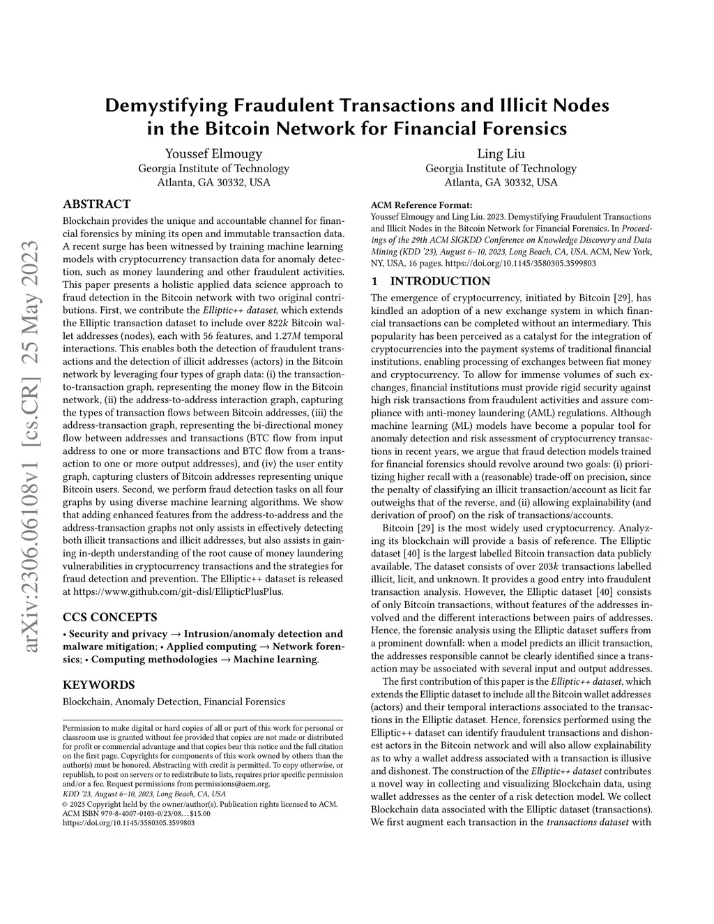 Blockchain provides the unique and accountable channel for financial forensics by mining its open and immutable transaction data. A recent surge has been witnessed by training machine learning models with cryptocurrency transaction data for anomaly detection, such as money laundering and other fraudulent activities. This paper presents a holistic applied data science approach to fraud detection in the Bitcoin network with two original contributions. First, we contribute the Elliptic++ dataset, which extends the Elliptic transaction dataset to include over 822k Bitcoin wallet addresses (nodes), each with 56 features, and 1.27M temporal interactions. This enables both the detection of fraudulent transactions and the detection of illicit addresses (actors) in the Bitcoin network by leveraging four types of graph data: (i) the transaction-to-transaction graph, representing the money flow in the Bitcoin network, (ii) the address-to-address interaction graph, capturing the types of transaction flows between Bitcoin addresses, (iii) the address-transaction graph, representing the bi-directional money flow between addresses and transactions (BTC flow from input address to one or more transactions and BTC flow from a transaction to one or more output addresses), and (iv) the user entity graph, capturing clusters of Bitcoin addresses representing unique Bitcoin users. Second, we perform fraud detection tasks on all four graphs by using diverse machine learning algorithms. We show that adding enhanced features from the address-to-address and the address-transaction graphs not only assists in effectively detecting both illicit transactions and illicit addresses, but also assists in gaining in-depth understanding of the root cause of money laundering vulnerabilities in cryptocurrency transactions and the strategies for fraud detection and prevention. Released at github.com/git-disl/EllipticPlusPlus.