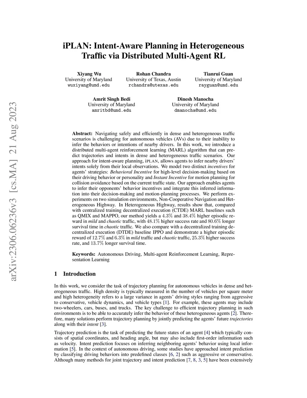 Navigating safely and efficiently in dense and heterogeneous traffic scenarios is challenging for autonomous vehicles (AVs) due to their inability to infer the behaviors or intentions of nearby drivers. In this work, we introduce a distributed multi-agent reinforcement learning (MARL) algorithm that can predict trajectories and intents in dense and heterogeneous traffic scenarios. Our approach for intent-aware planning, iPLAN, allows agents to infer nearby drivers' intents solely from their local observations. We model two distinct incentives for agents' strategies: Behavioral Incentive for high-level decision-making based on their driving behavior or personality and Instant Incentive for motion planning for collision avoidance based on the current traffic state. Our approach enables agents to infer their opponents' behavior incentives and integrate this inferred information into their decision-making and motion-planning processes. We perform experiments on two simulation environments, Non-Cooperative Navigation and Heterogeneous Highway. In Heterogeneous Highway, results show that, compared with centralized training decentralized execution (CTDE) MARL baselines such as QMIX and MAPPO, our method yields a 4.3% and 38.4% higher episodic reward in mild and chaotic traffic, with 48.1% higher success rate and 80.6% longer survival time in chaotic traffic. We also compare with a decentralized training decentralized execution (DTDE) baseline IPPO and demonstrate a higher episodic reward of 12.7% and 6.3% in mild traffic and chaotic traffic, 25.3% higher success rate, and 13.7% longer survival time.