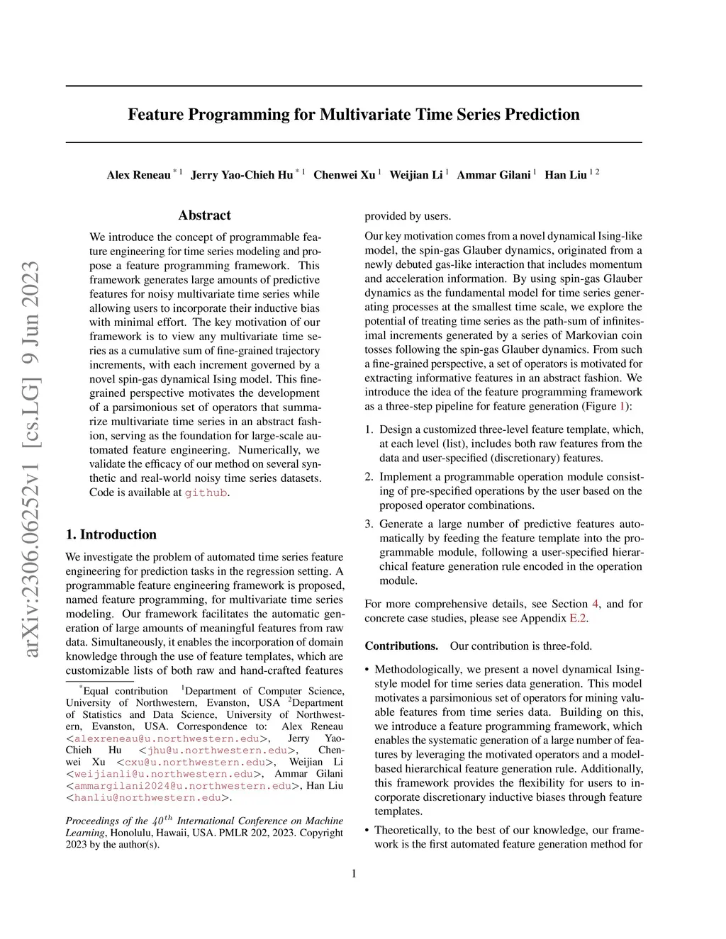 We introduce the concept of programmable feature engineering for time series modeling and propose a feature programming framework. This framework generates large amounts of predictive features for noisy multivariate time series while allowing users to incorporate their inductive bias with minimal effort. The key motivation of our framework is to view any multivariate time series as a cumulative sum of fine-grained trajectory increments, with each increment governed by a novel spin-gas dynamical Ising model. This fine-grained perspective motivates the development of a parsimonious set of operators that summarize multivariate time series in an abstract fashion, serving as the foundation for large-scale automated feature engineering. Numerically, we validate the efficacy of our method on several synthetic and real-world noisy time series datasets.