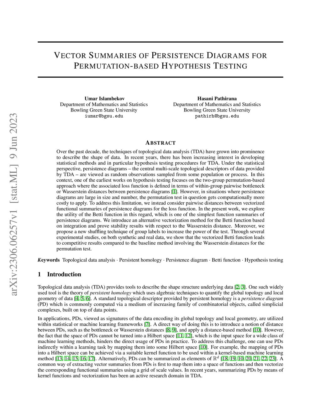 Over the past decade, the techniques of topological data analysis (TDA) have grown into prominence to describe the shape of data. In recent years, there has been increasing interest in developing statistical methods and in particular hypothesis testing procedures for TDA. Under the statistical perspective, persistence diagrams -- the central multi-scale topological descriptors of data provided by TDA -- are viewed as random observations sampled from some population or process. In this context, one of the earliest works on hypothesis testing focuses on the two-group permutation-based approach where the associated loss function is defined in terms of within-group pairwise bottleneck or Wasserstein distances between persistence diagrams (Robinson and Turner, 2017). However, in situations where persistence diagrams are large in size and number, the permutation test in question gets computationally more costly to apply. To address this limitation, we instead consider pairwise distances between vectorized functional summaries of persistence diagrams for the loss function. In the present work, we explore the utility of the Betti function in this regard, which is one of the simplest function summaries of persistence diagrams. We introduce an alternative vectorization method for the Betti function based on integration and prove stability results with respect to the Wasserstein distance. Moreover, we propose a new shuffling technique of group labels to increase the power of the test. Through several experimental studies, on both synthetic and real data, we show that the vectorized Betti function leads to competitive results compared to the baseline method involving the Wasserstein distances for the permutation test.